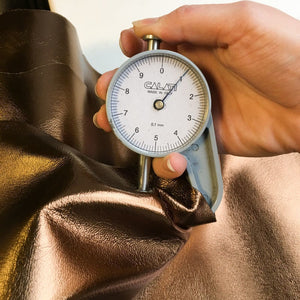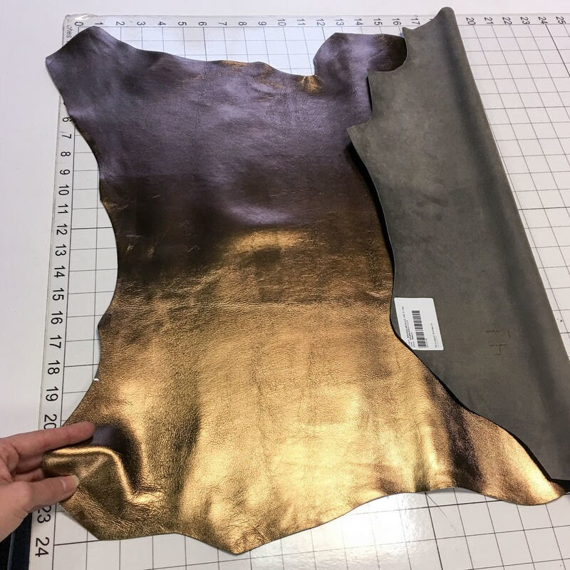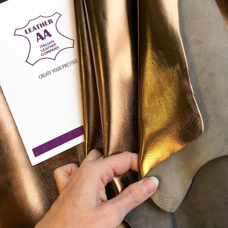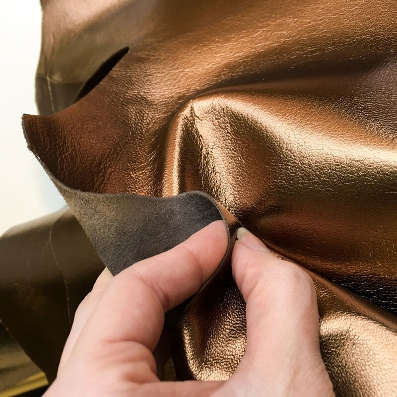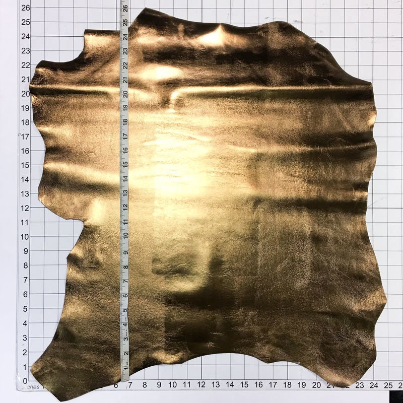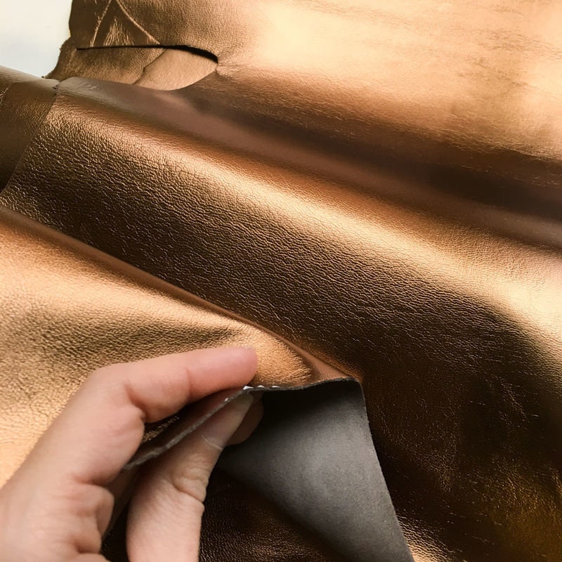 -Quite firm and supple bronze leather, pleasant for touch, medium thin dark gold sheep hides are great for leather crafts, is not elastic, good for leather crafts that require firm, bit rigid leather. Festive and luxurious bronze color print on shaved lamb leather. Can be used as fabric for glossy bag making, shiny leaf leather earrings, natural leather material for necklaces and other charming, shiny, luxurious accessories. Perfect material for brave and stunning look!