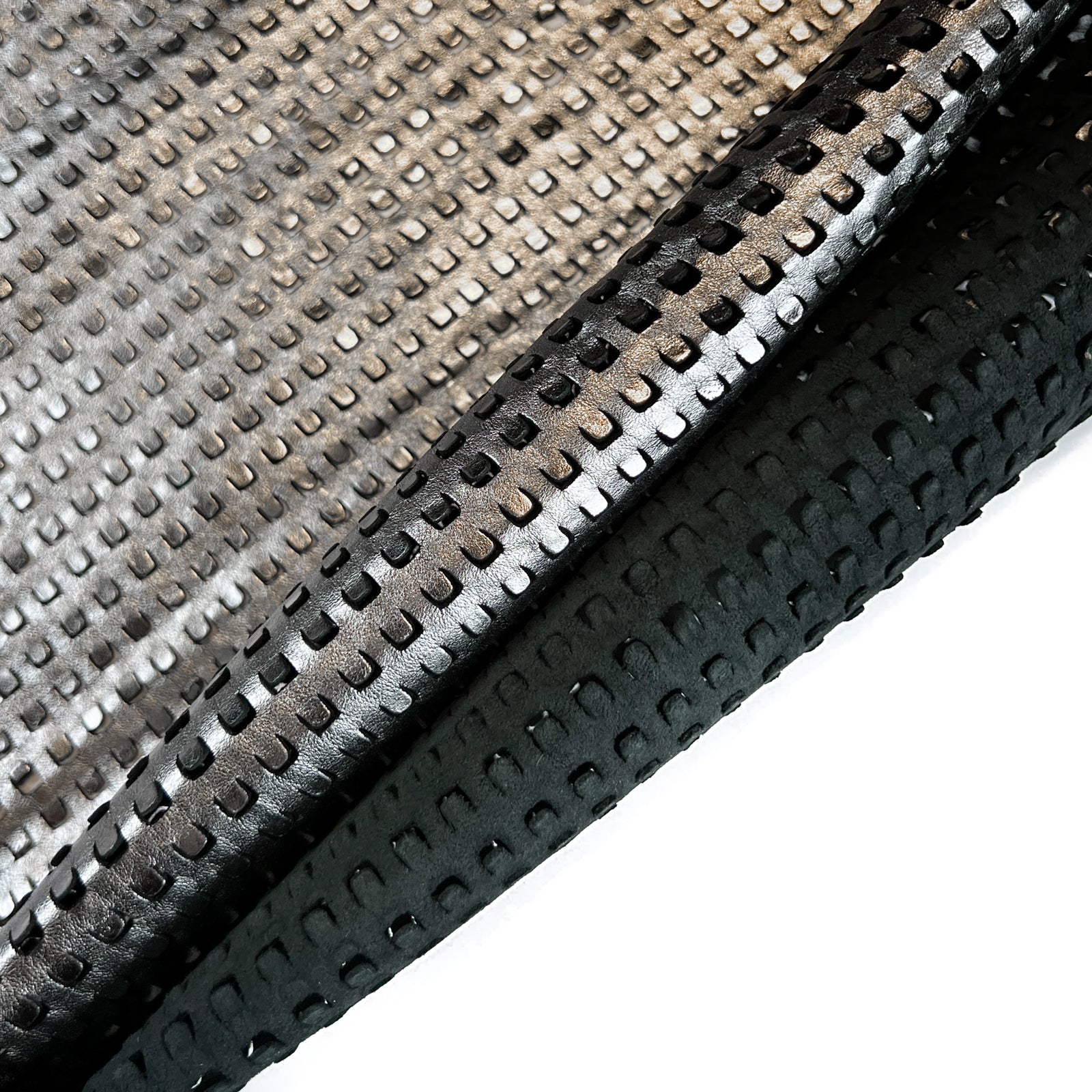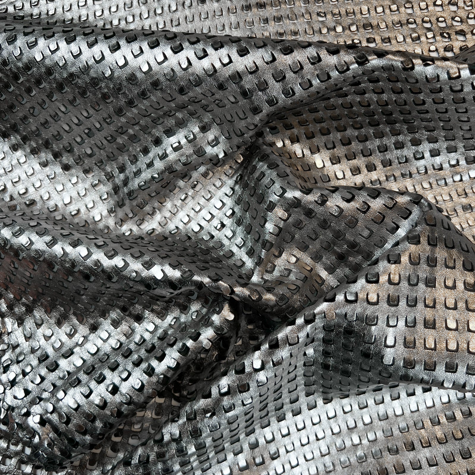 Dark silver metallic lambskin with perforated laser-cut hides. Amazing leather for bag and purse crafters will be long-lasting. Our mission is to provide only the highest quality Italian leather to other leather workers, crafters of all kinds, small businesses, or shops for your projects.