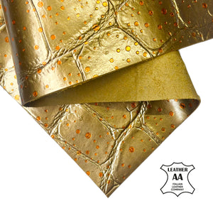 Add a touch of luxury to your creative projects with this gold metallic lambskin leather sheet. Featuring a unique embossed crocodile-style texture with raised glossy dots that resemble water drops, this Italian leather is both elegant and eye-catching.. ✨