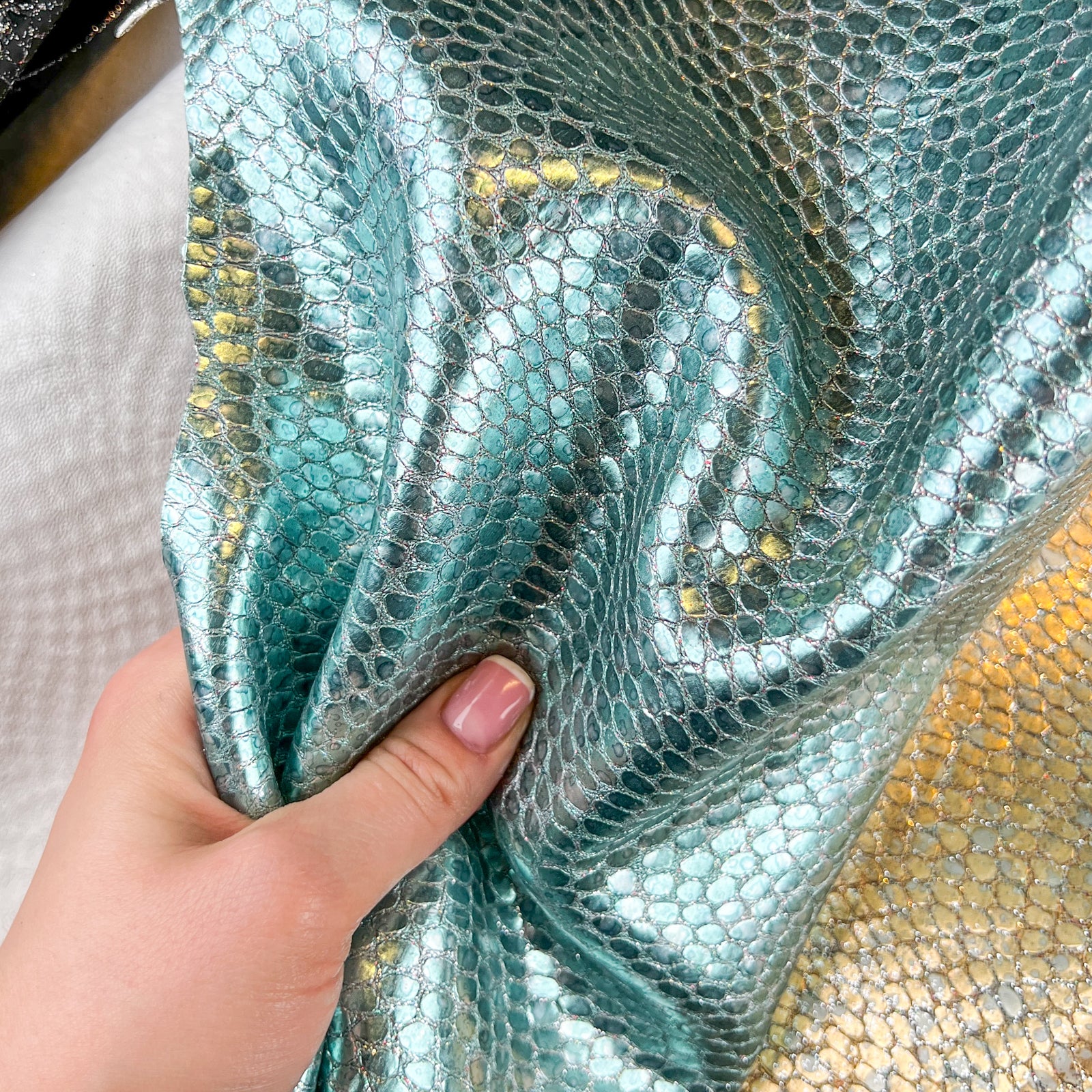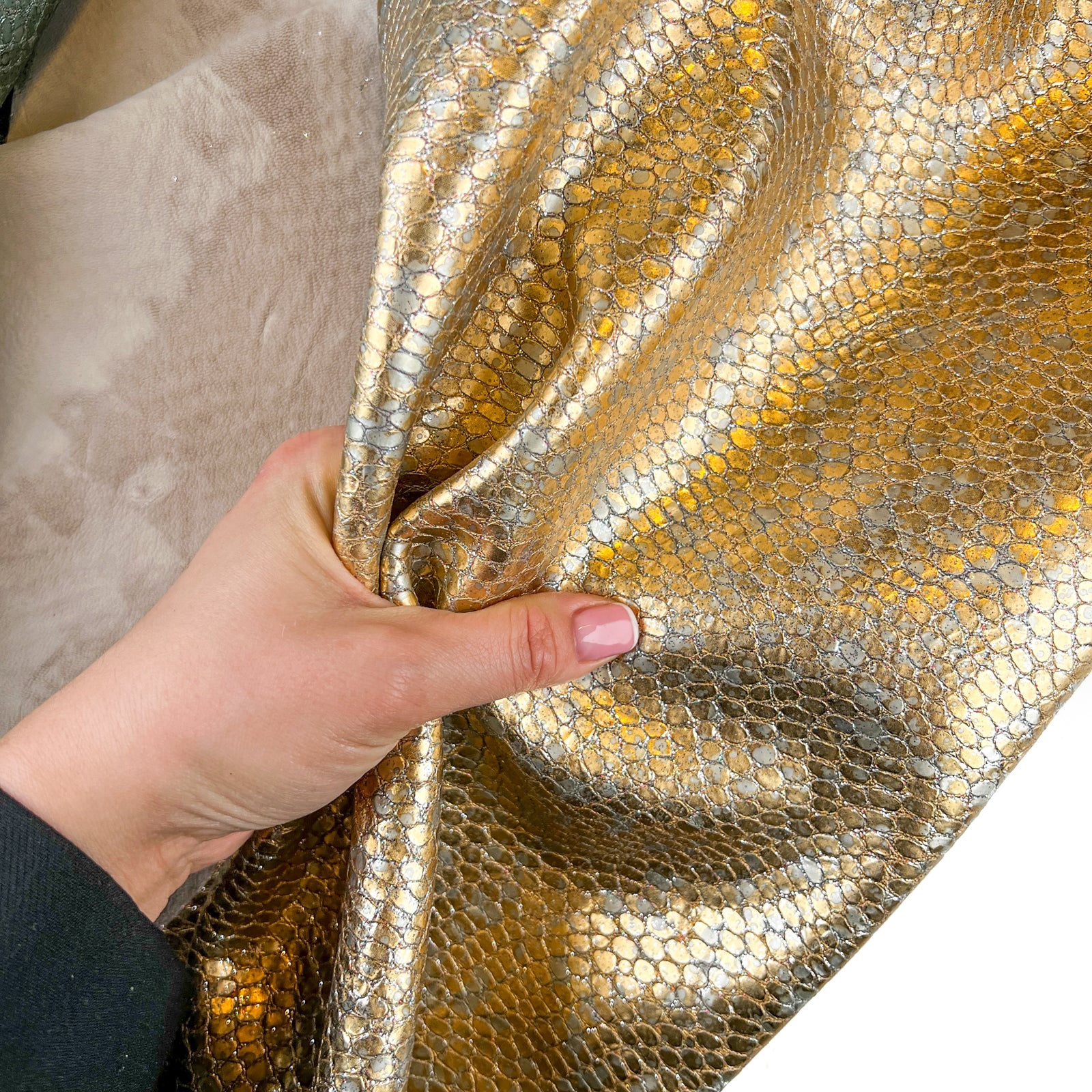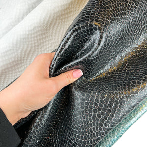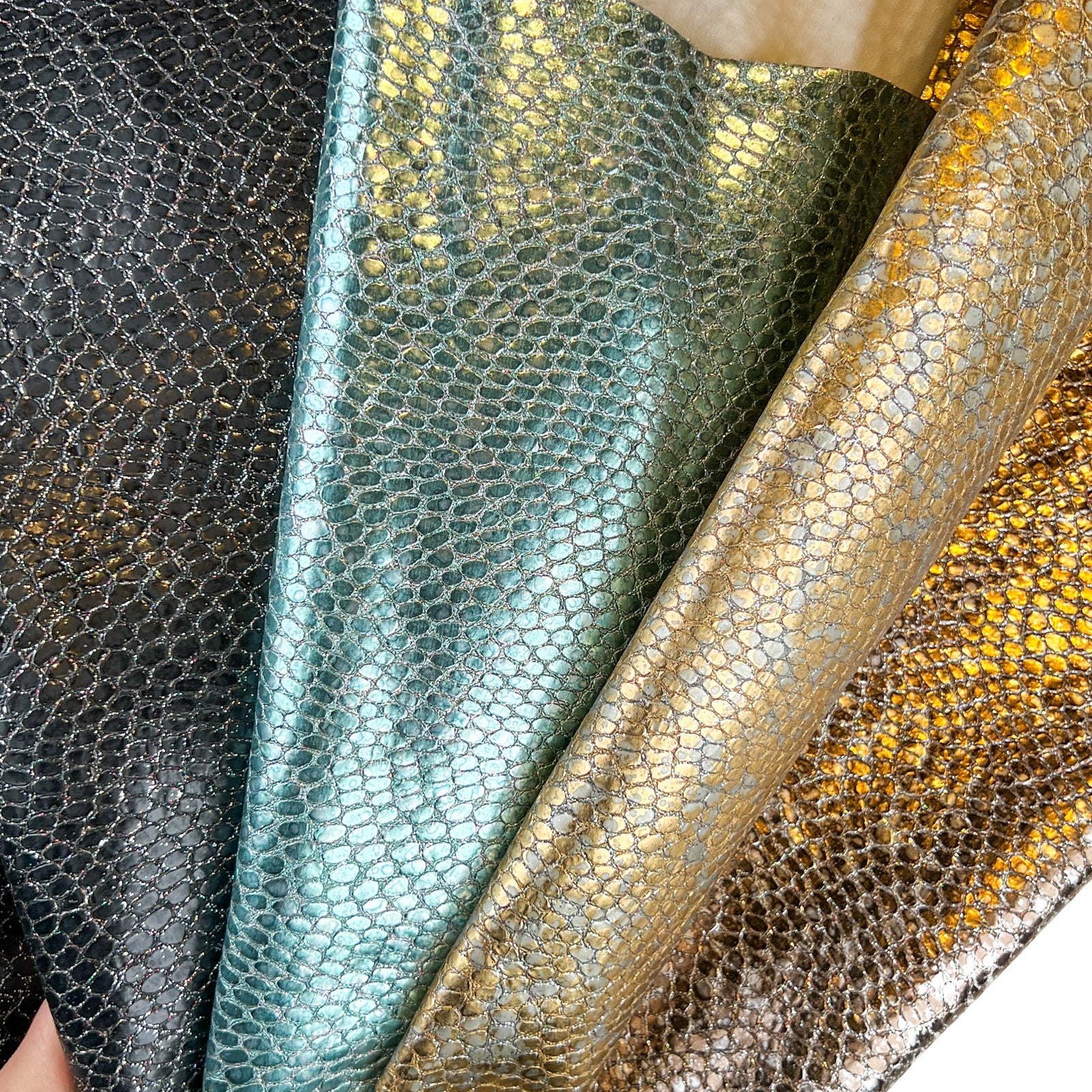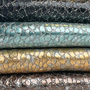 Metallic sparkle lambskin with embossed reptile print. Choose your color! Thick pieces for crafting. Amazing leather for bag and purse crafters will be long-lasting. Our mission is to provide only the highest quality Italian leather to other leather workers, crafters of all kinds, small businesses, or shops for your own projects.