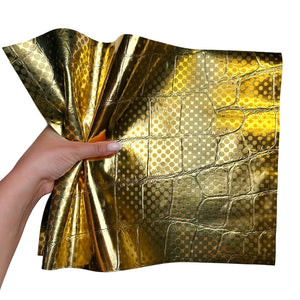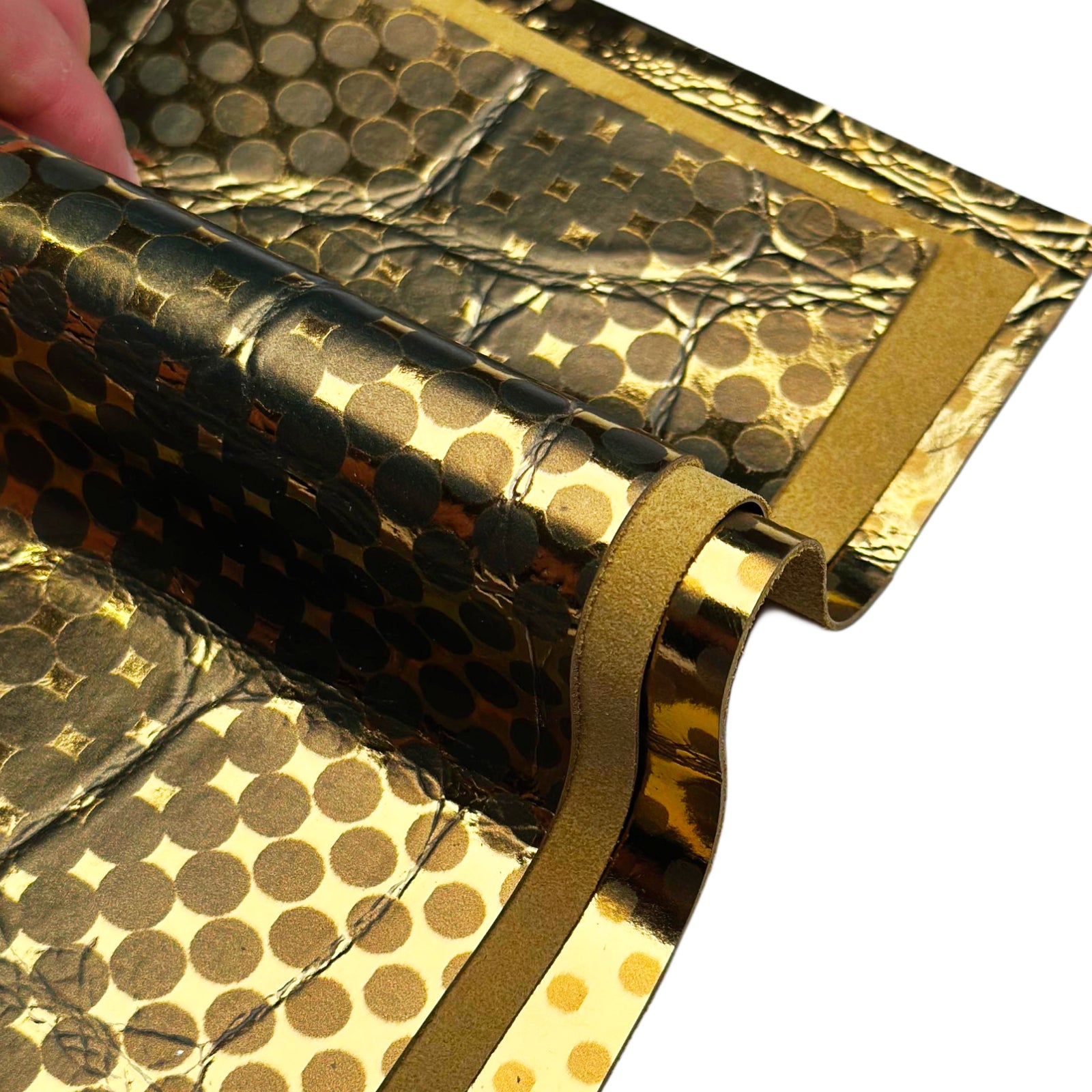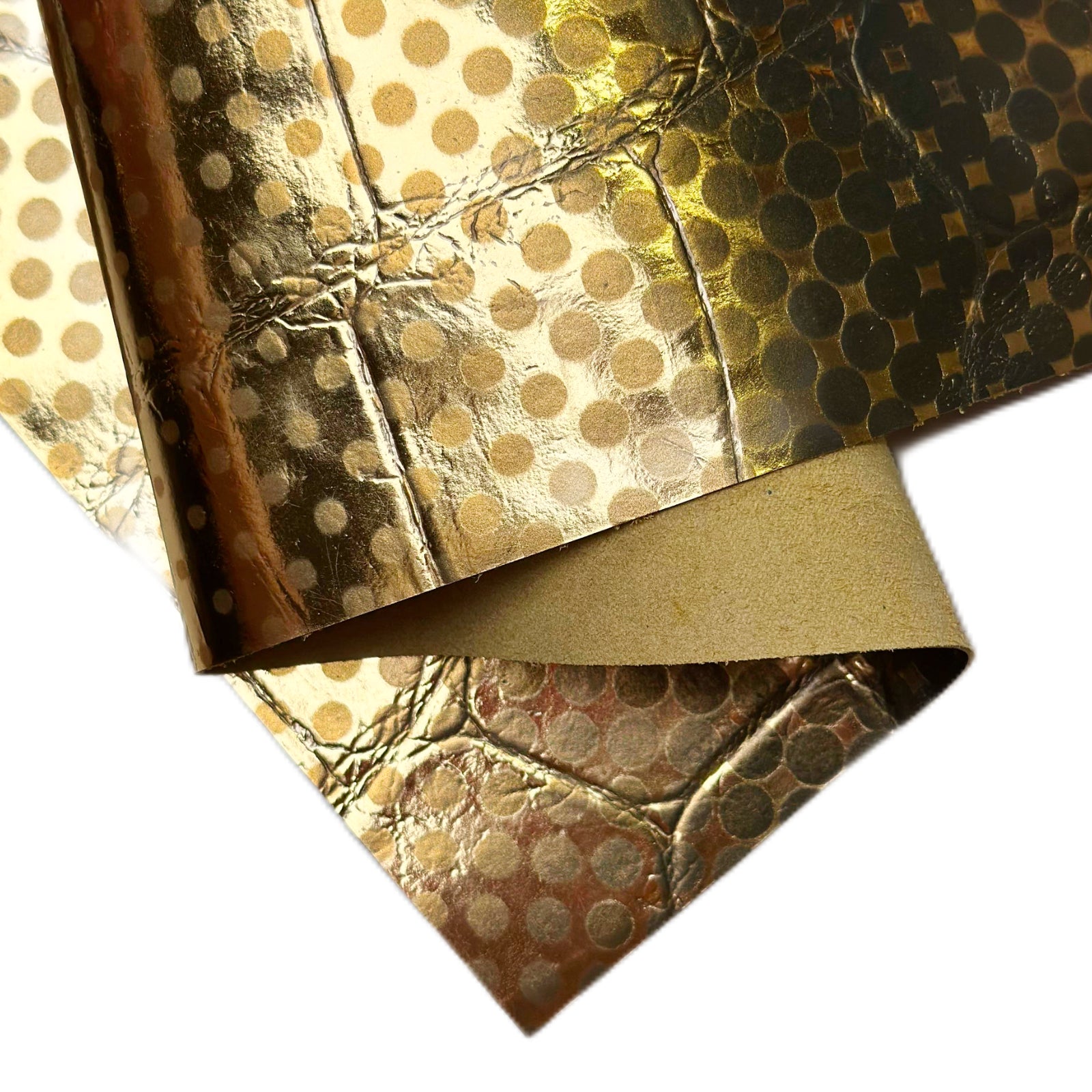 Make a bold statement in your leather projects with this glamorous gold foil lambskin leather, featuring a metallic polka dot pattern. Perfect for high-end accessories, fashion items, or unique interior accents. ✨