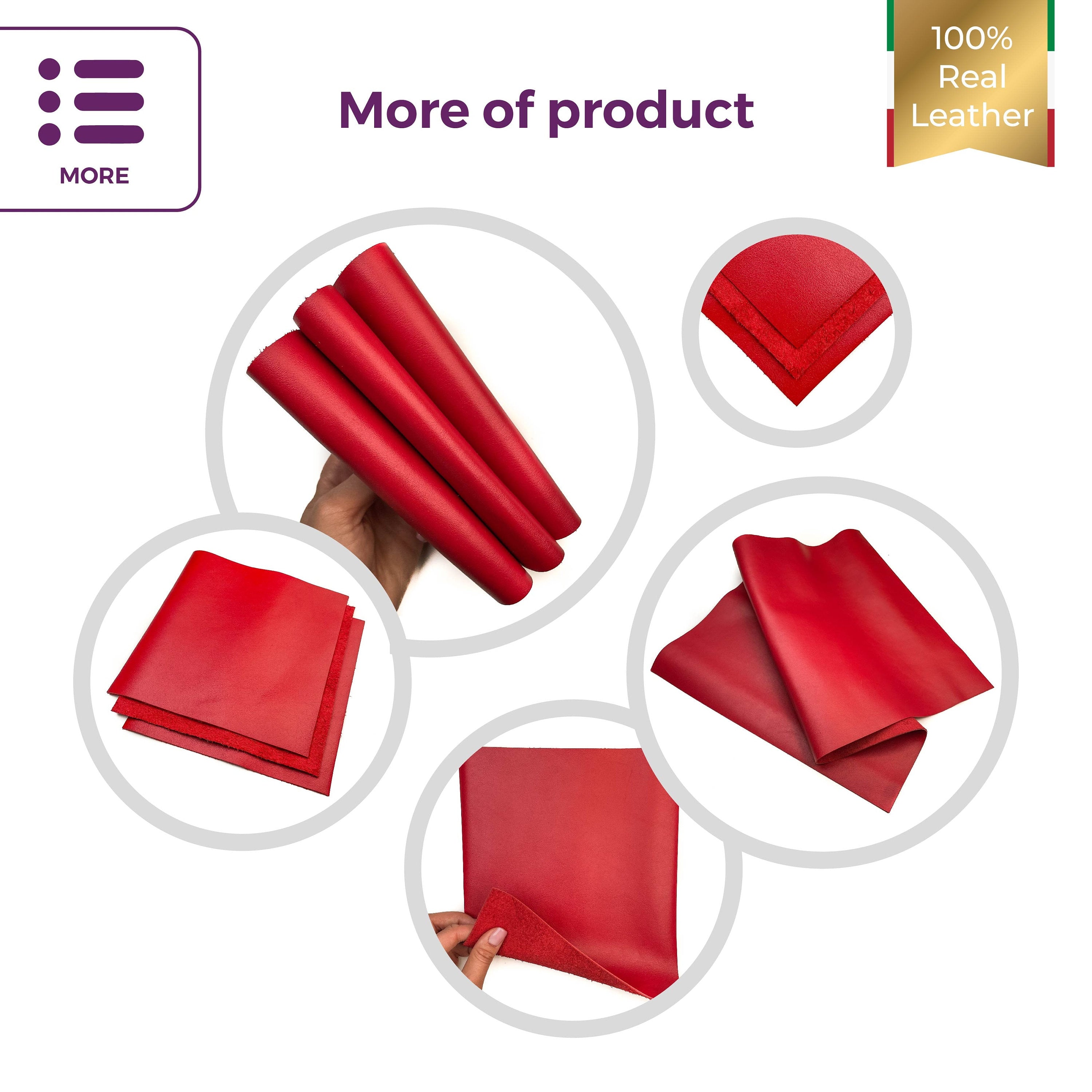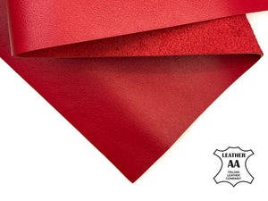 - Beautiful red calfskin leather pieces. Shiny sheets for handcrafting. Material is soft but will hold its form. Backside is light red.