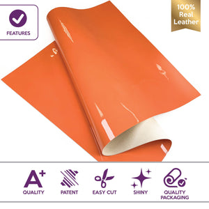 - Bright orange leather sheets. Shiny patent leather. Thick leather sheets with light gloss all over it. Perfect for sewing, bright earrings and other cool projects. Great material for varios leather projects. Backside is clean, grained.