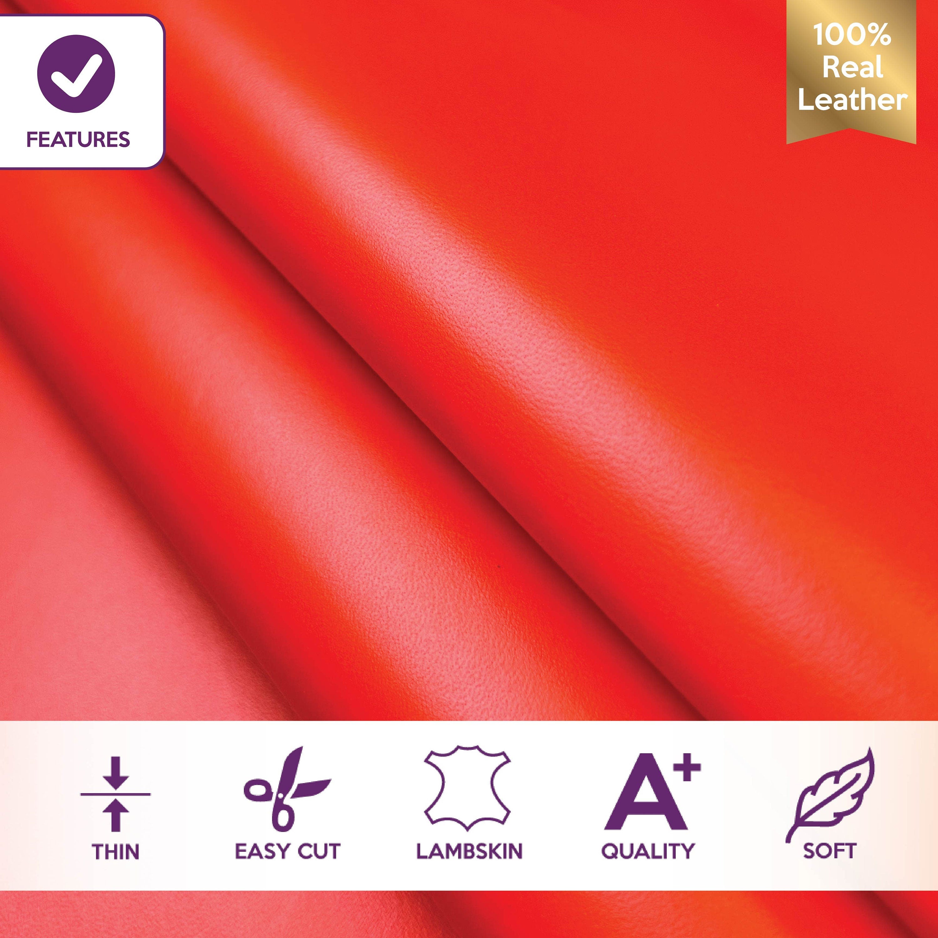 - Genuine lambskin leather in vivid colors that will impress everyone - red in one light, orange in another. Juicy, perfect for spring!The backside is dull orange. Leather is soft, pleasant to touch, and will perfectly suit both accessories and clothing. Thickness 0.8mm // 2oz