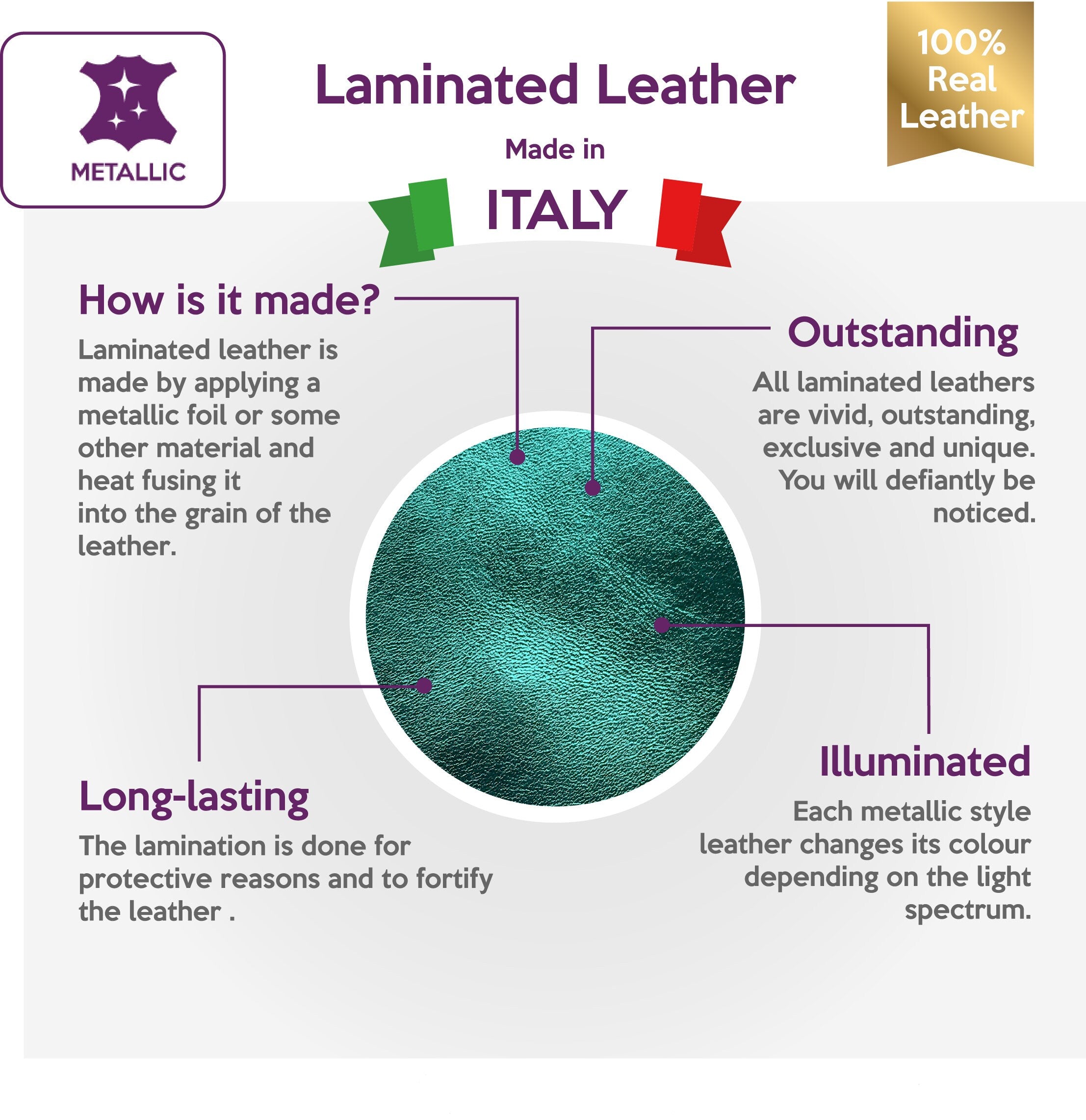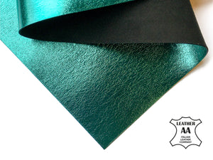 EMERALD GREEN METALLIC SHEEP SKIN LEATHER SHEETS Genuine Lambskin leather in gorgeous emerald metallic color. This leather is quite flexible and has soft temper. Clean and fine, charcoal black suede backside....