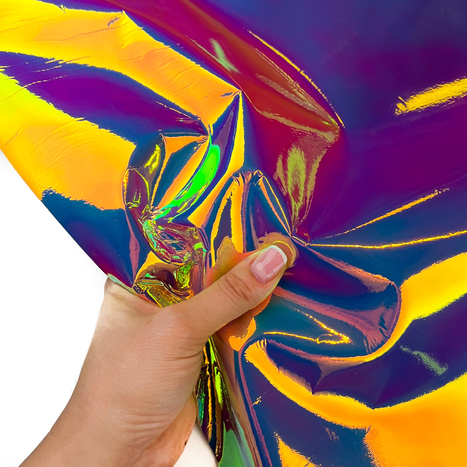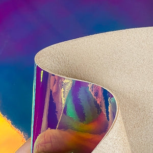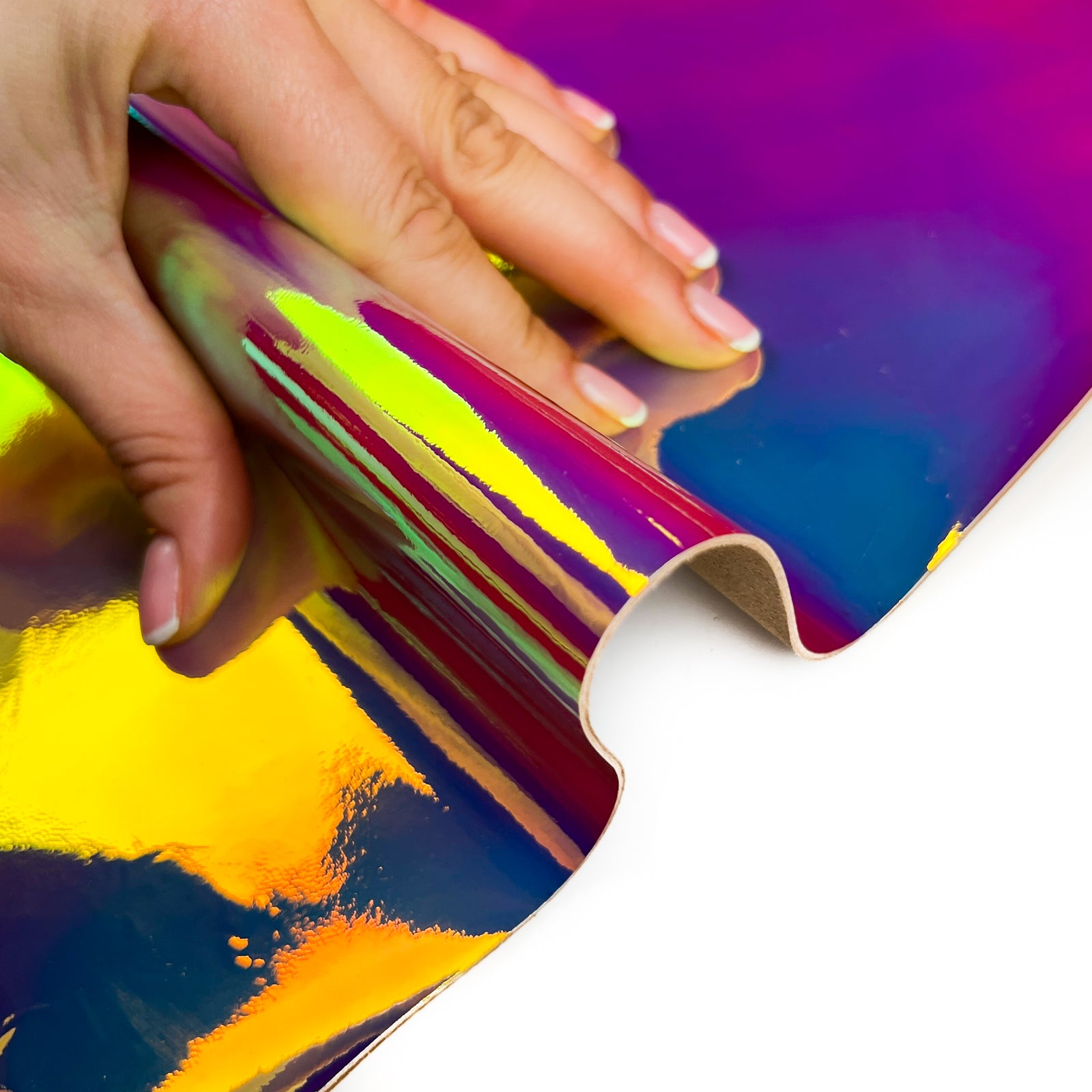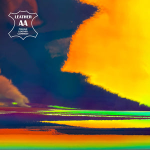 Bright Various metallic purple, blue and pink leather holographic colors. Shiny mirror effect. Need to be careful with folding - can leave visible marks. Amazing leather for bag and purse crafters...
