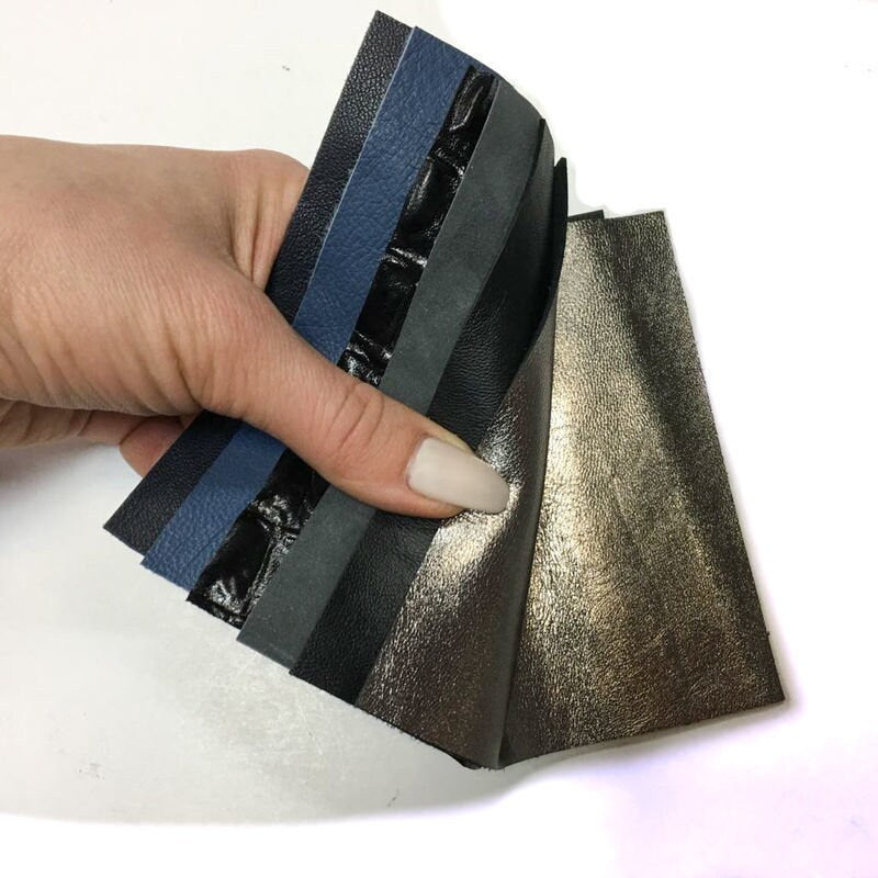 MIST MIX leather pre cut sheet set - textured, embossed leather sheet, metallic leather, Black and blue nappa leather scraps with FREE SHIPPING Worldwide. 6 quality leather pieces 5x5 inch -Dark silver metallic, Black pebbled textured leather, Pale blue, dark blue leather, Black nappa, Gray suede sheet 6pack, perfect leather sheets for crafts. Small leather pieces, pre-cut leather scraps.