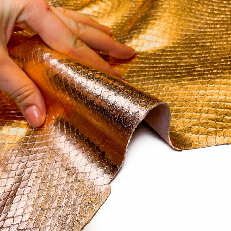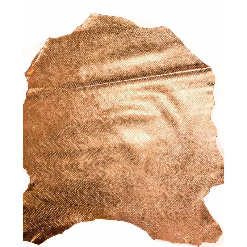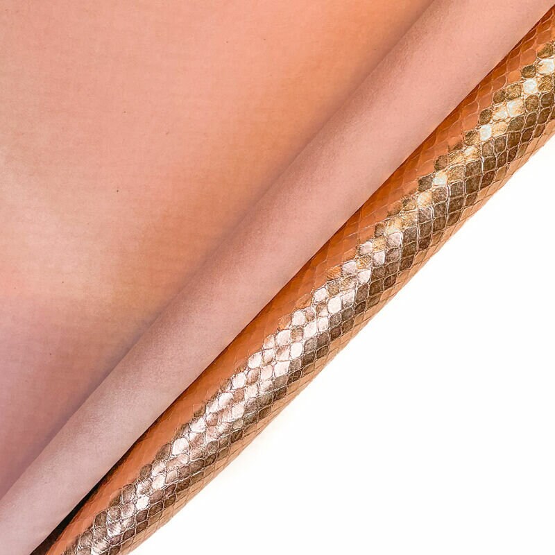 Rose gold leather pieces with snakeskin print. Textured leather for your best projects! Our mission is to provide only the best quality Italian leather to other leather workers, crafters of all kinds, small businesses, or Etsy shop for your own projects.
