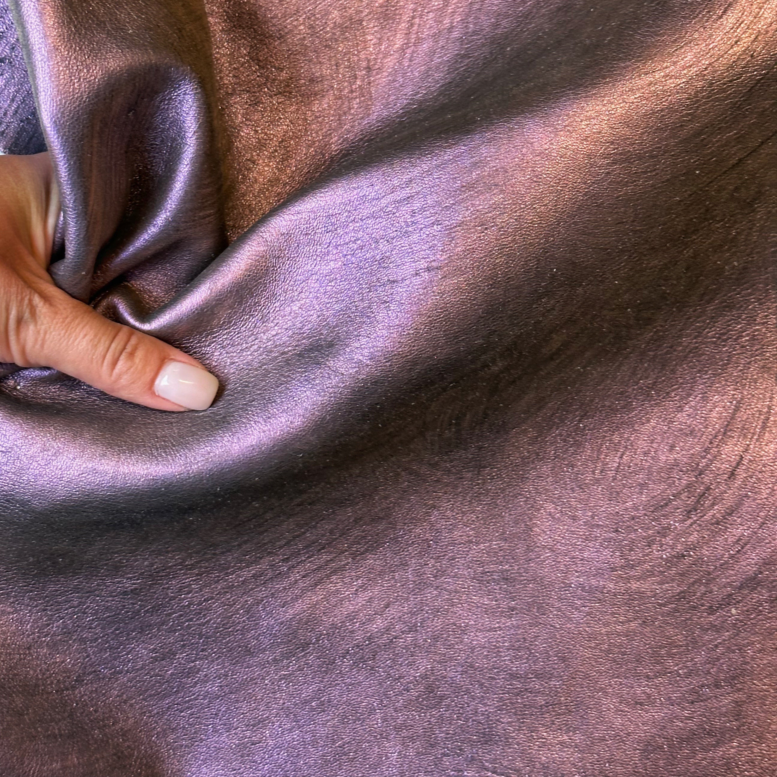 Violet shiny metallic lambskin leather with a print that looks like paint brush imprints. Thick genuine textured hides. Amazing leather for bag and purse crafters will be long-lasting. Our mission is to provide only the highest quality Italian leather to other leather workers, crafters of all kinds, small businesses, or shops for your projects.