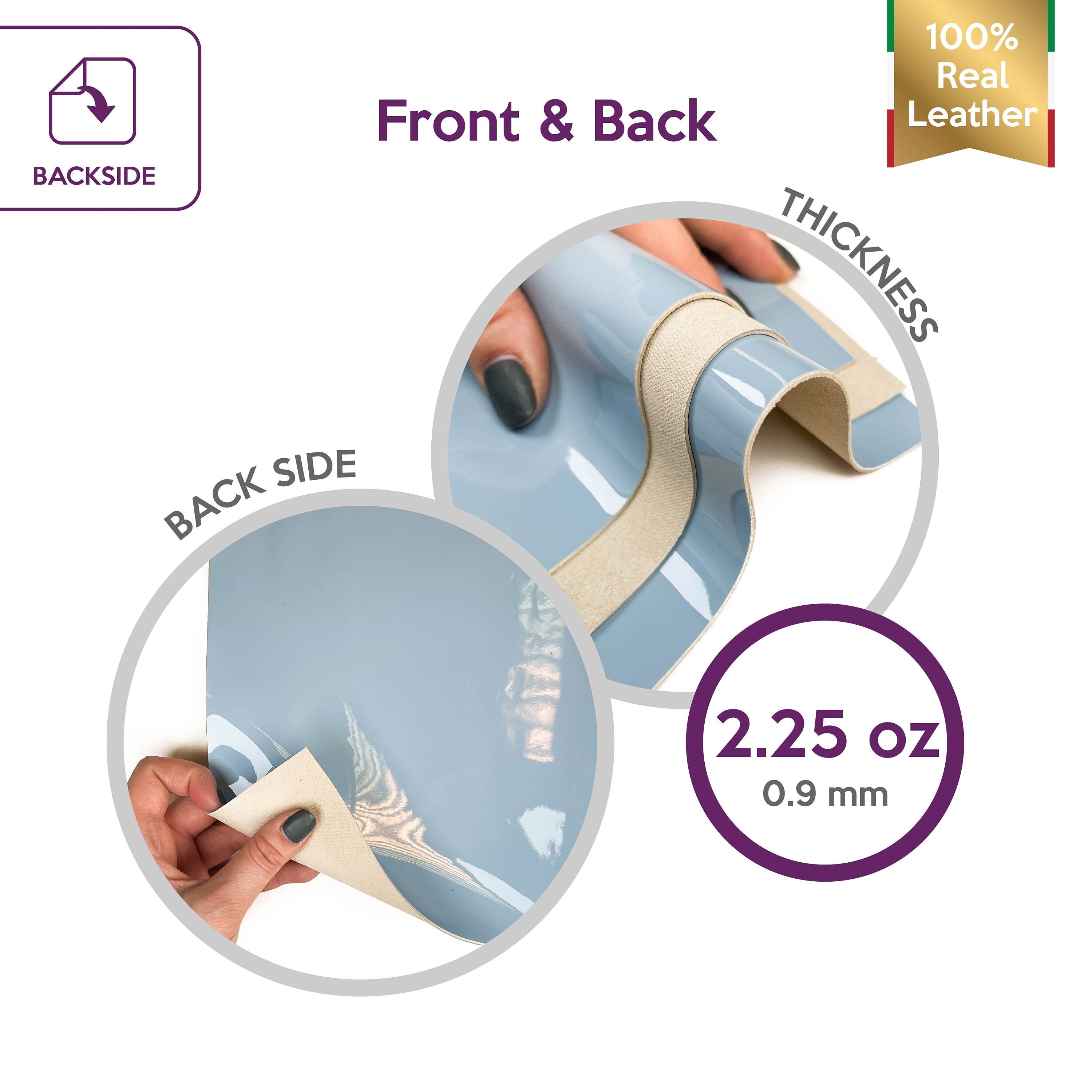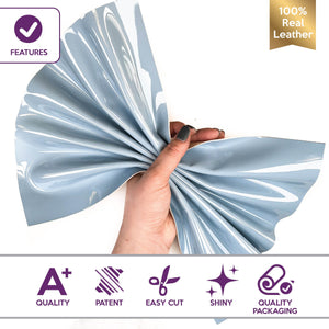 - Light blue leather sheets. Beautiful shiny patent leather. Thick leather sheets with light gloss all over it. Perfect for sewing, earrings and other cool projects. Great material for varios leather projects. Backside is clean, grained.