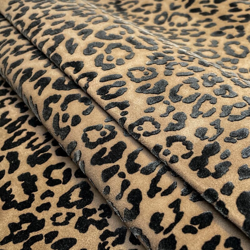 - Soft beige suede leather with unique velvet material leopard spots. Really soft to touch. Bit thick but easy to fold. Natural lambskin hides from the best Italian tannery. Perfect leather for sewing and crafting.