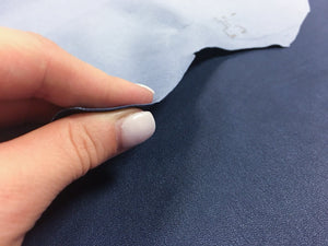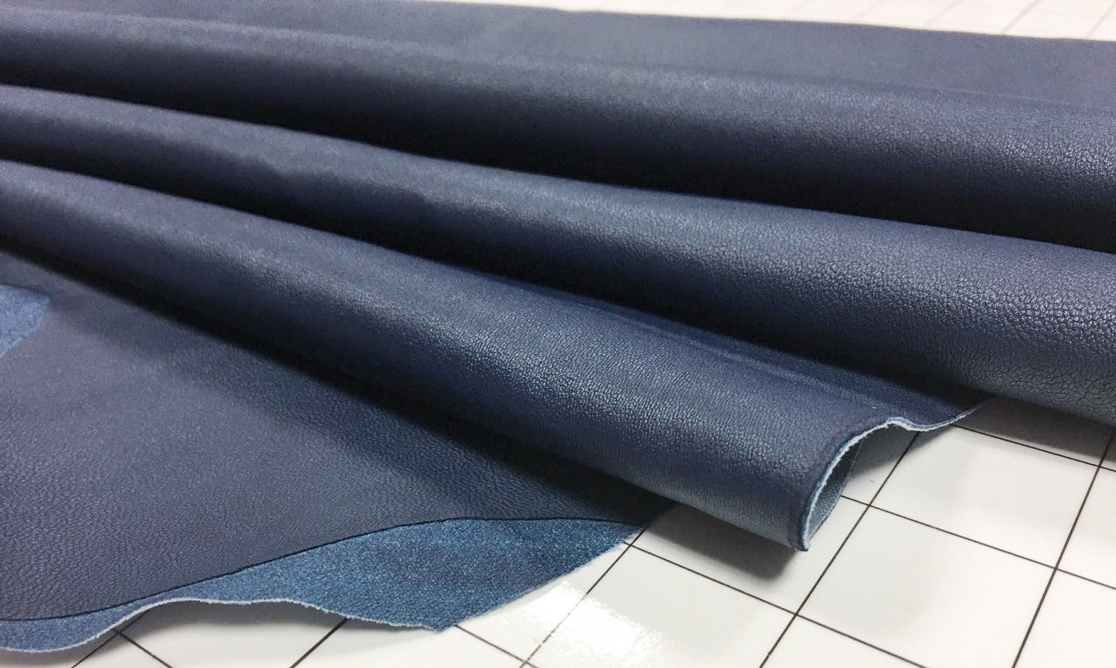 -Denim Blue elastic leather sheets, leather material good for sewing, thin enough to sew it with Your home sewing machine. Leteather pieces that have a cotton layer on one side, it makes it more elastic and make it to "come back" and not to stretch so fast, for ecample in the knees or elbows. Blue sheep skin material would look perfect as denim leather leggings or deep blue pencil skirt. It is meant to be as something body shape immitating You totally will be super satissfied with this leather. We guarantee.