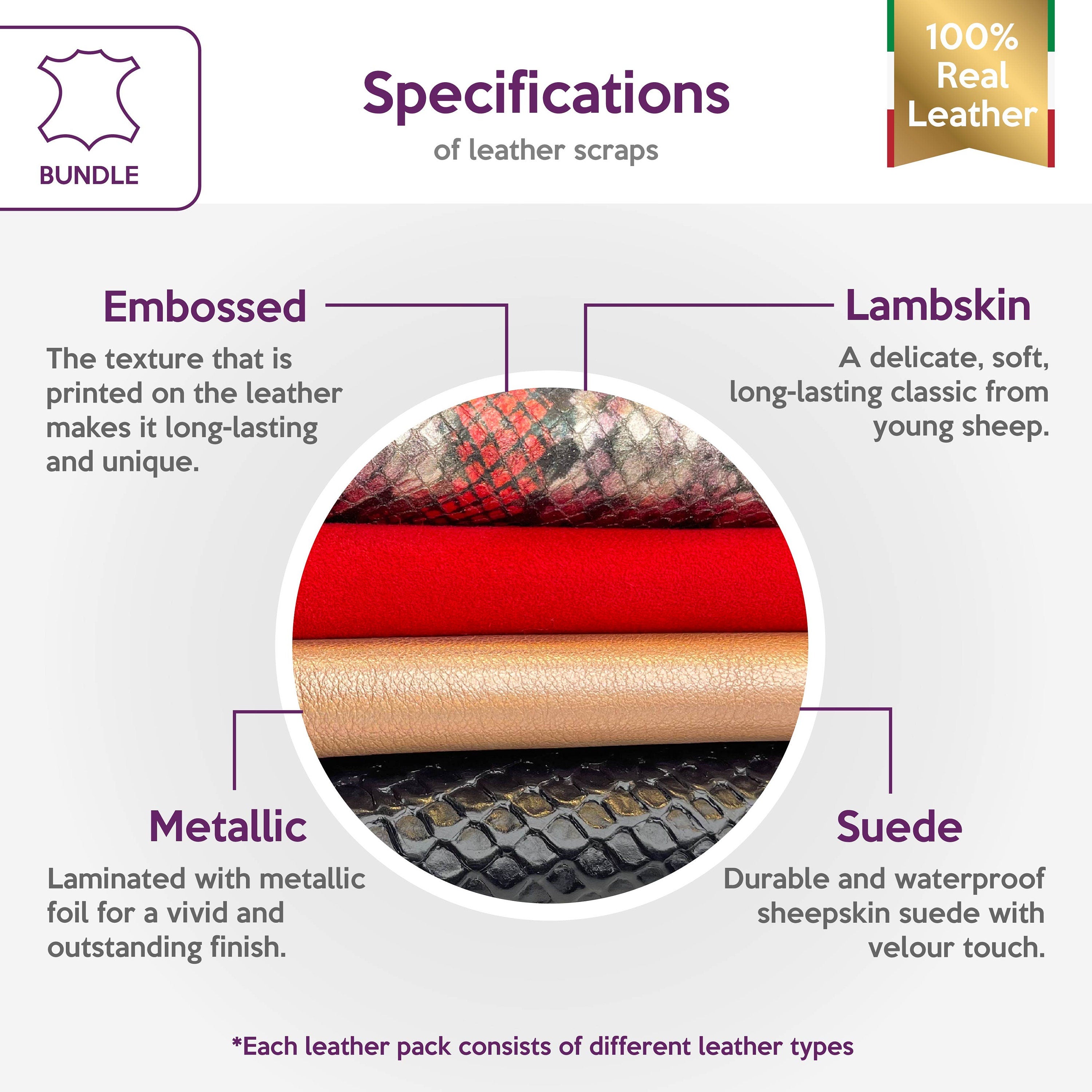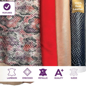 High-quality lambskin leather bundle of 4. Includes the softest sheepskin leather, beautiful metallics, and unique embossing.