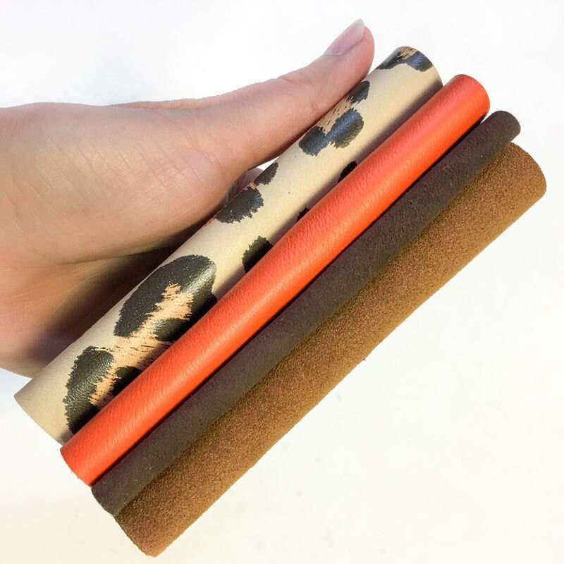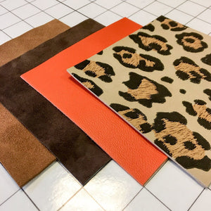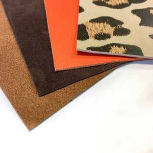 JAGUAR MIX leather pre cut sheet set - nappa leather, suede sheets and leather print piece with FREE SHIPPING Worldwide. 4 quality leather pieces 5x5 inch - 2 brown suede pieces, bright orange nappa sheet and brown JAGUAR leather print leather sheet 4pack, perfect leather sheets for crafts. Best choice for your project!
