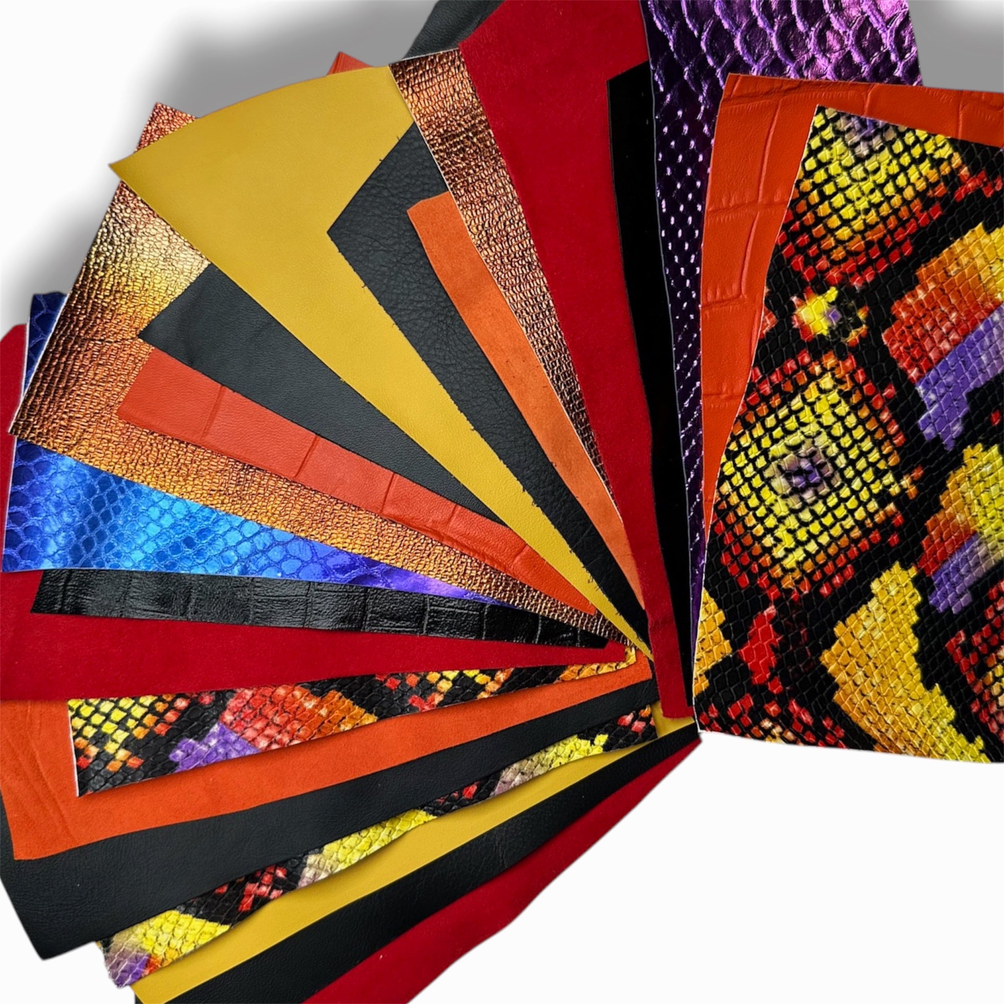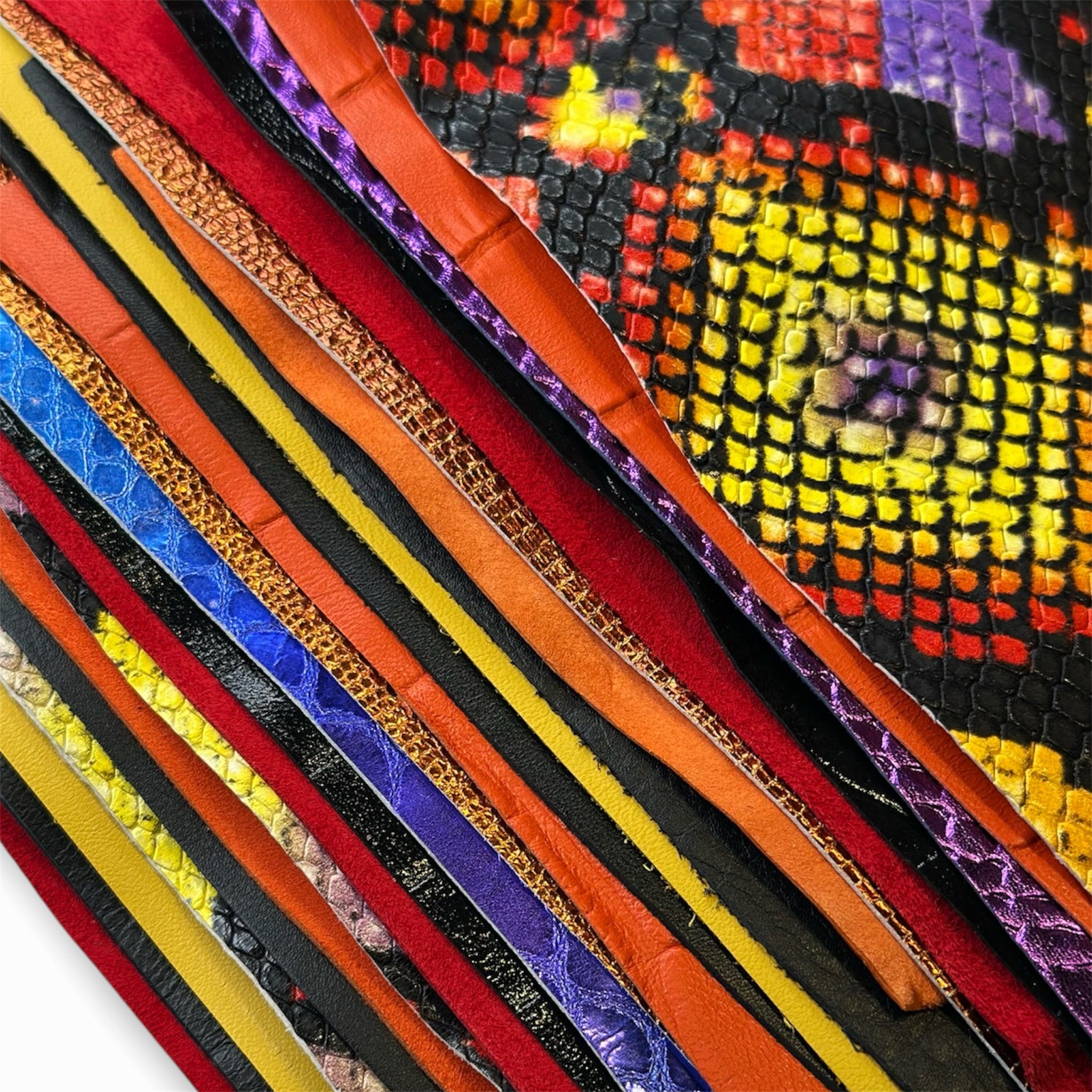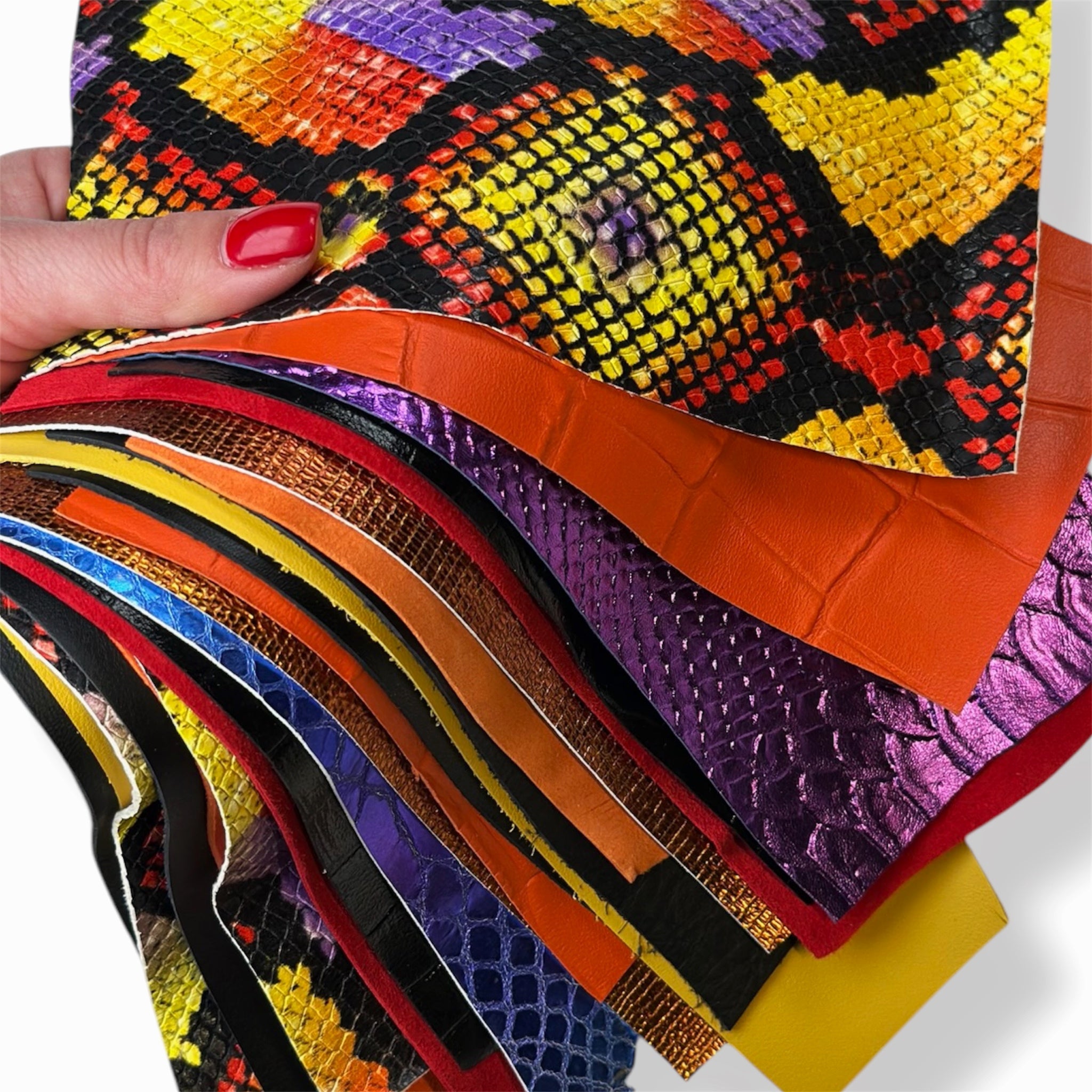 Limited edition! High-quality Italian lambskin leather pre-cut scraps. Colorful snakeskin print, orange and black crocodile print, metallic violet snake print, black and yellow lambskin, metallic rose gold with print, metallic blue snakeskin print, red and orange suede.