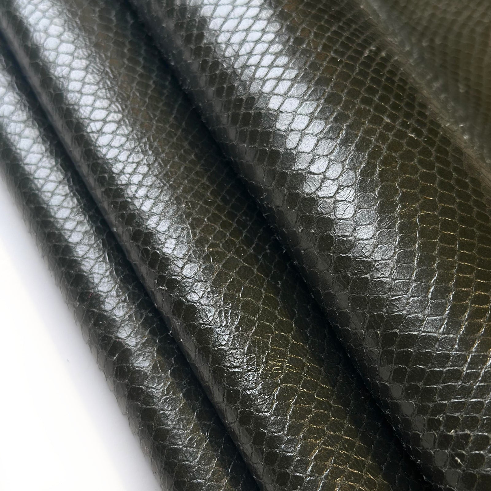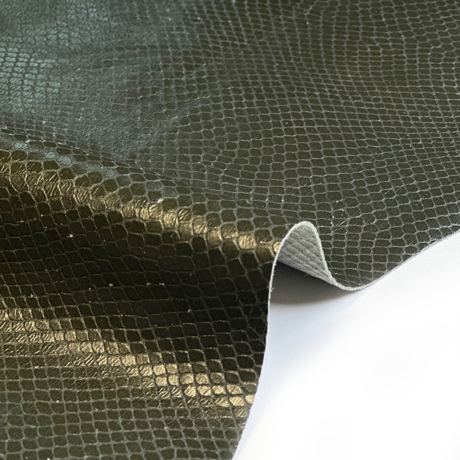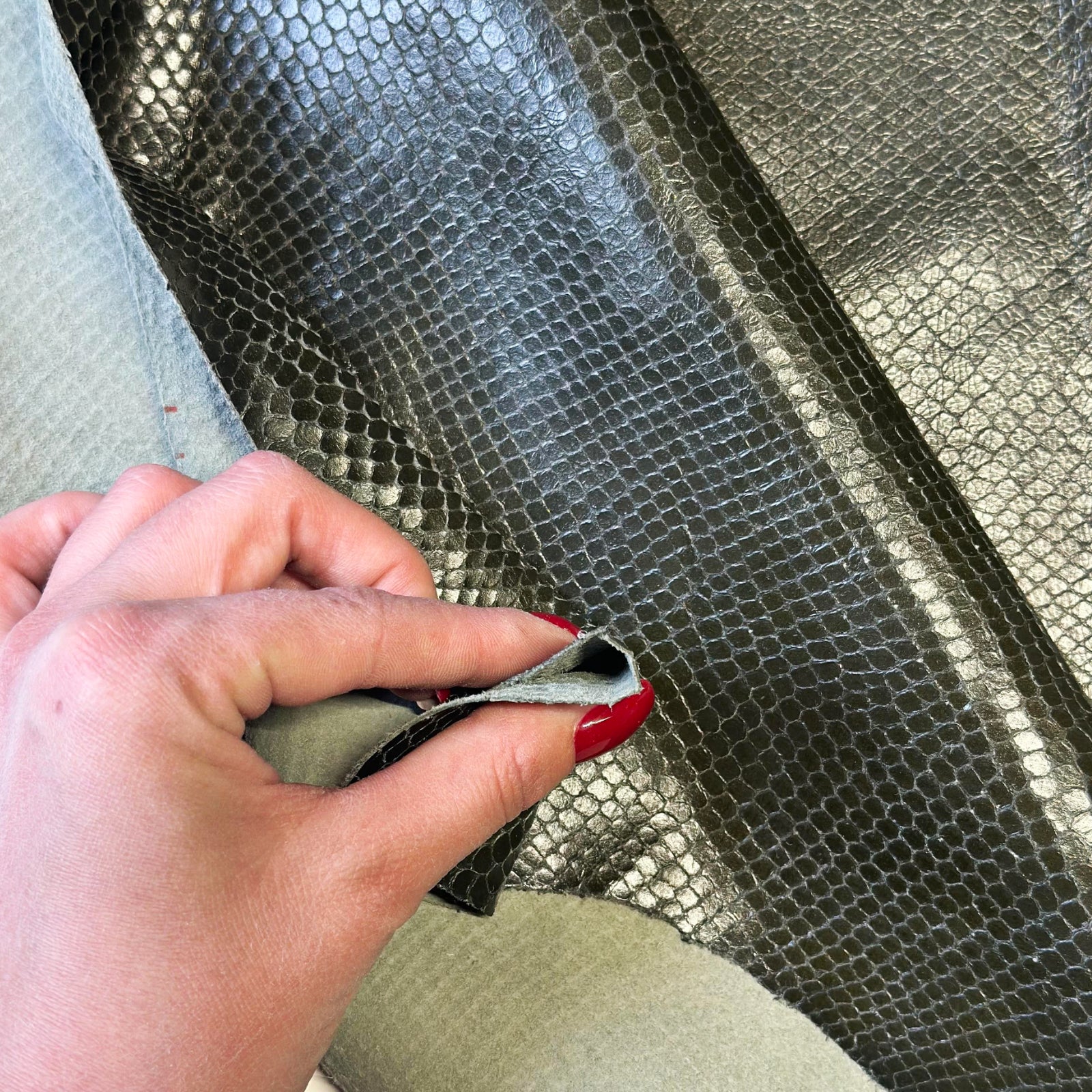 Dark green lambskin leather with embossed lizard print. Shiny Italian sewing leather.