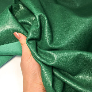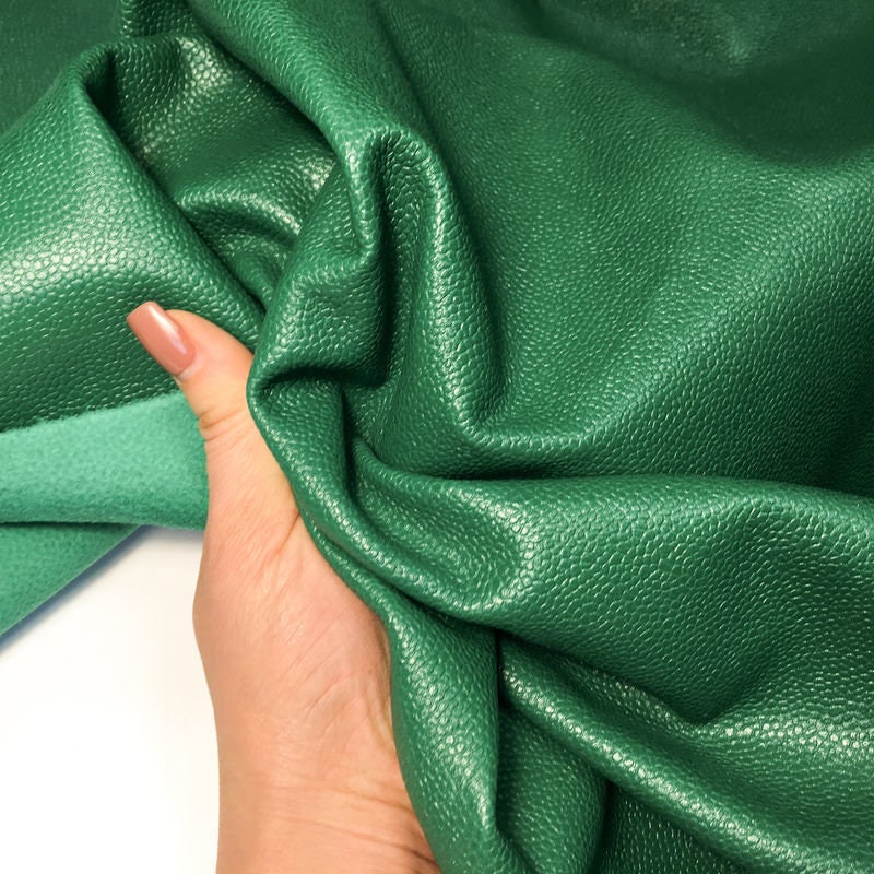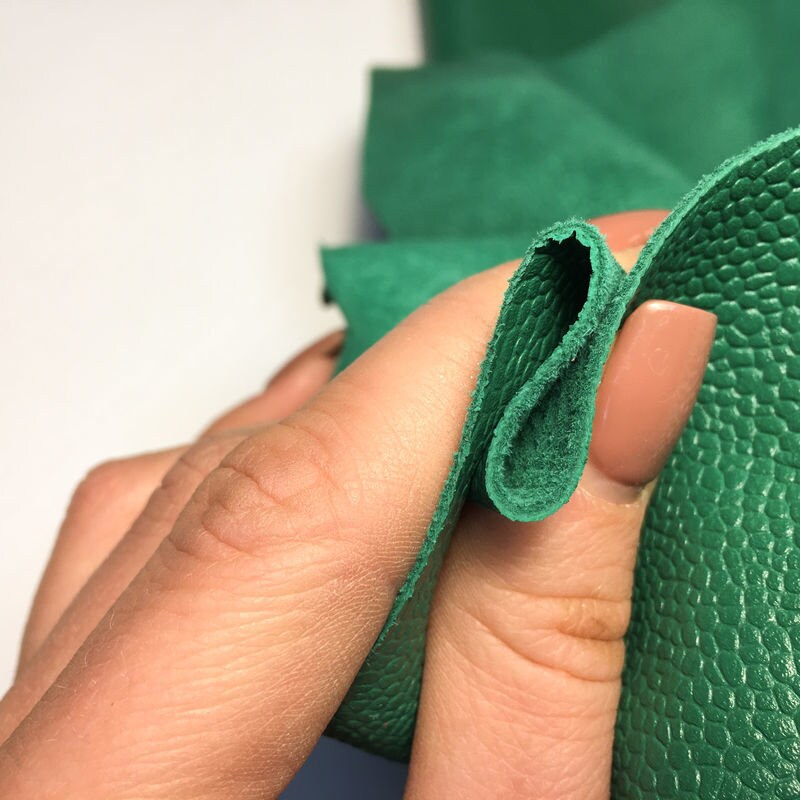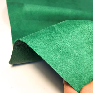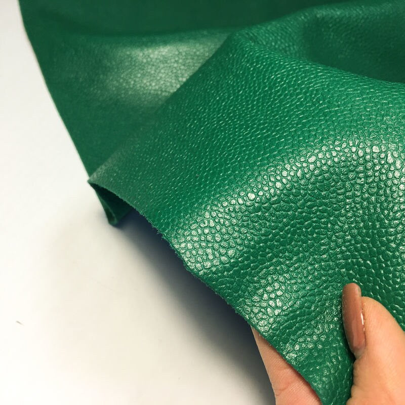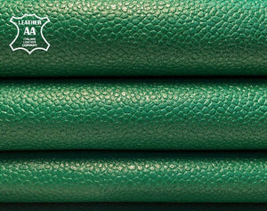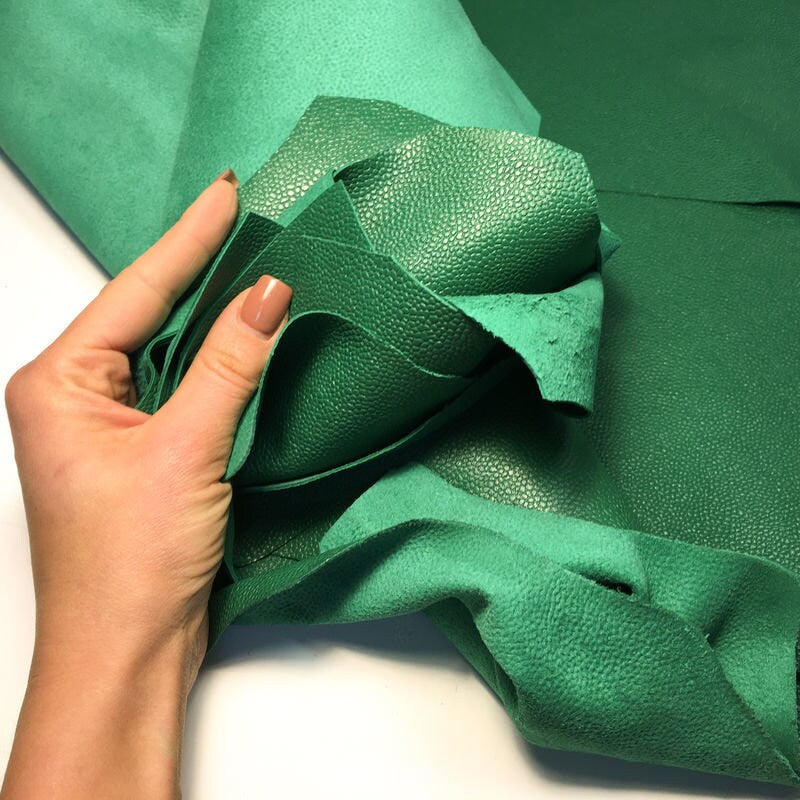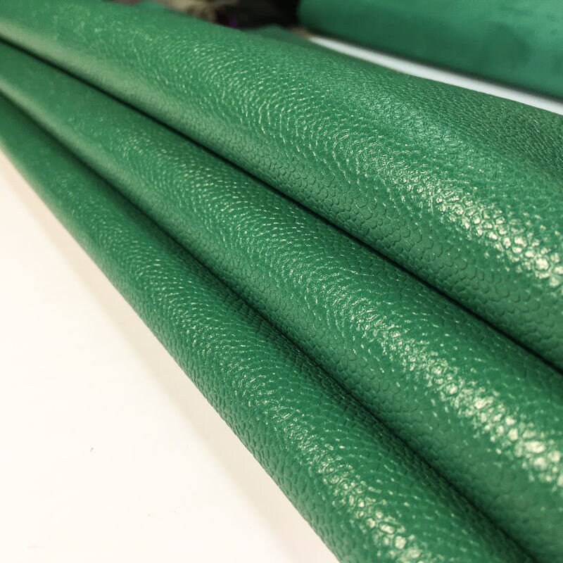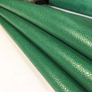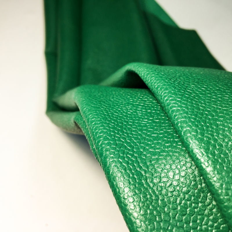 -GREEN textured leather fabric, colored throughout, deep coloring, bright and rich color. Quite thick but soft leather skins. Sell in full hides. Firm and high quality leather pieces. Has this little water drop texture.