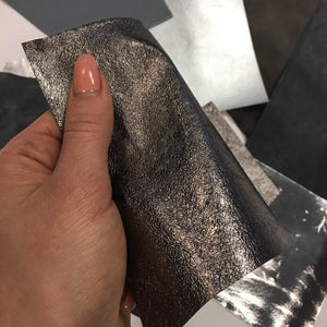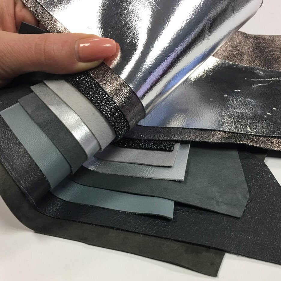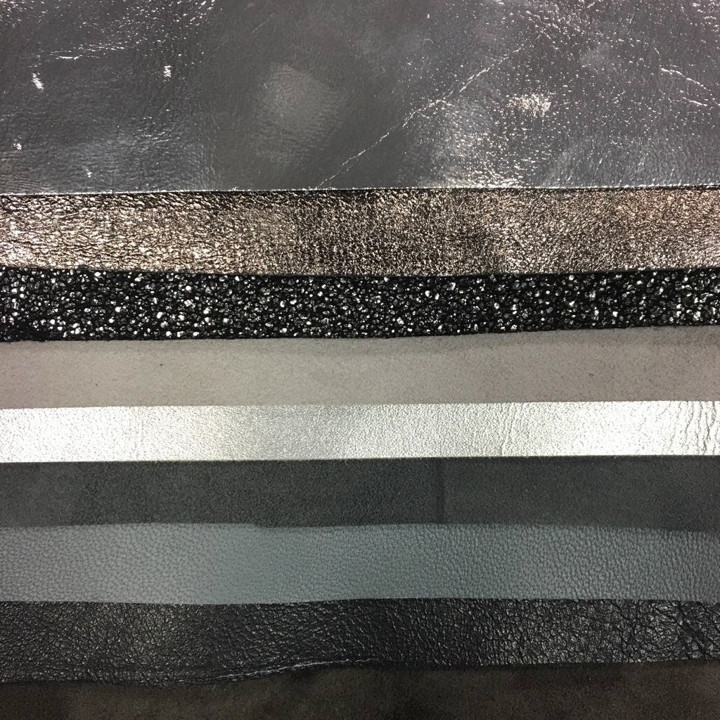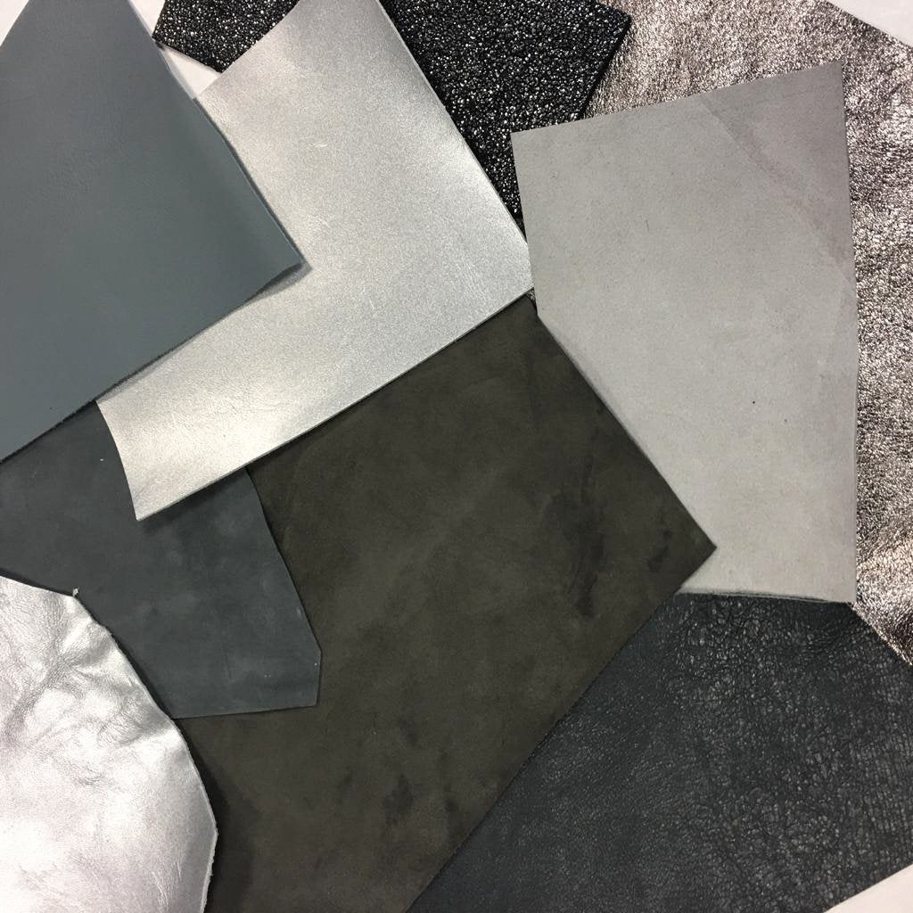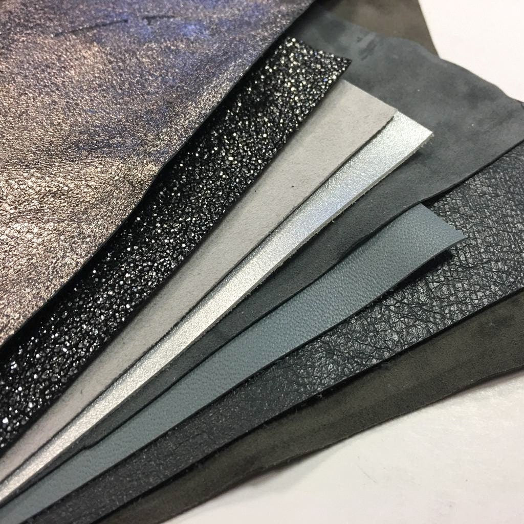 Colors: Gray shades: light gray nappa/suede, dark gray, blue-gray, sliver metallic, dark silver metallic, may contain interesting textured/printed one-of-a-kind leather pieces that we have in stock at that moment