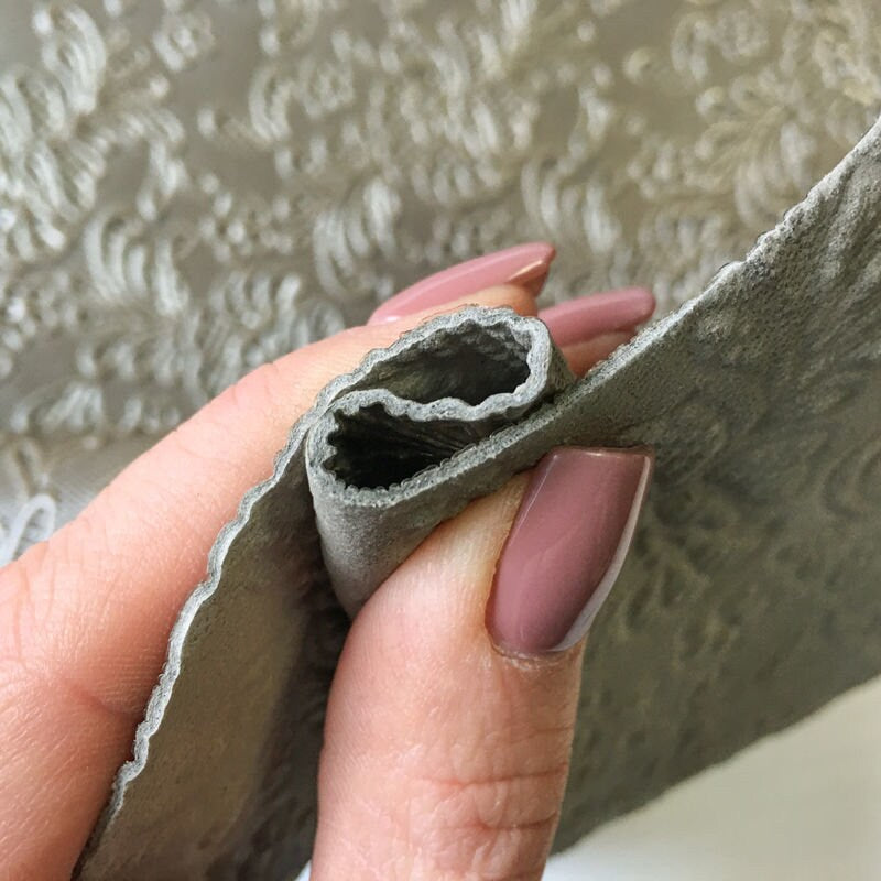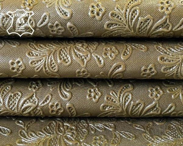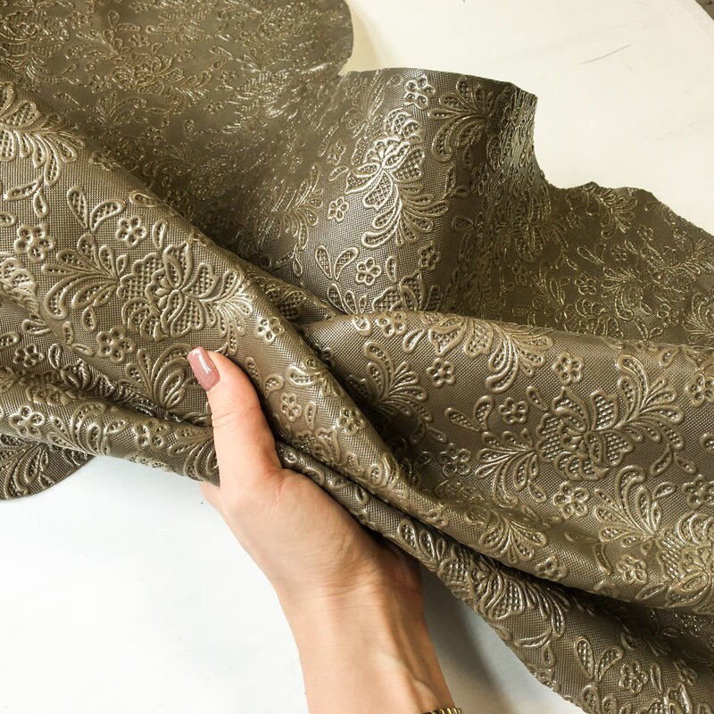 -Shiny lacquer leather print, covert green leather material with stamped flower print. Quite stiff and rough for sheep skin material. Small pieces ~ 0.4 m2 or 4.5 sqft. Interesting green color with brown shade in it. Called COVERT GREEN. Like army/ khaki green but less intense.