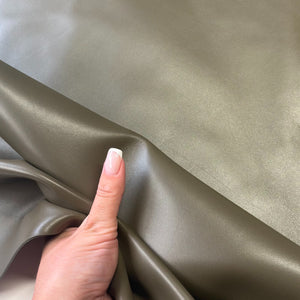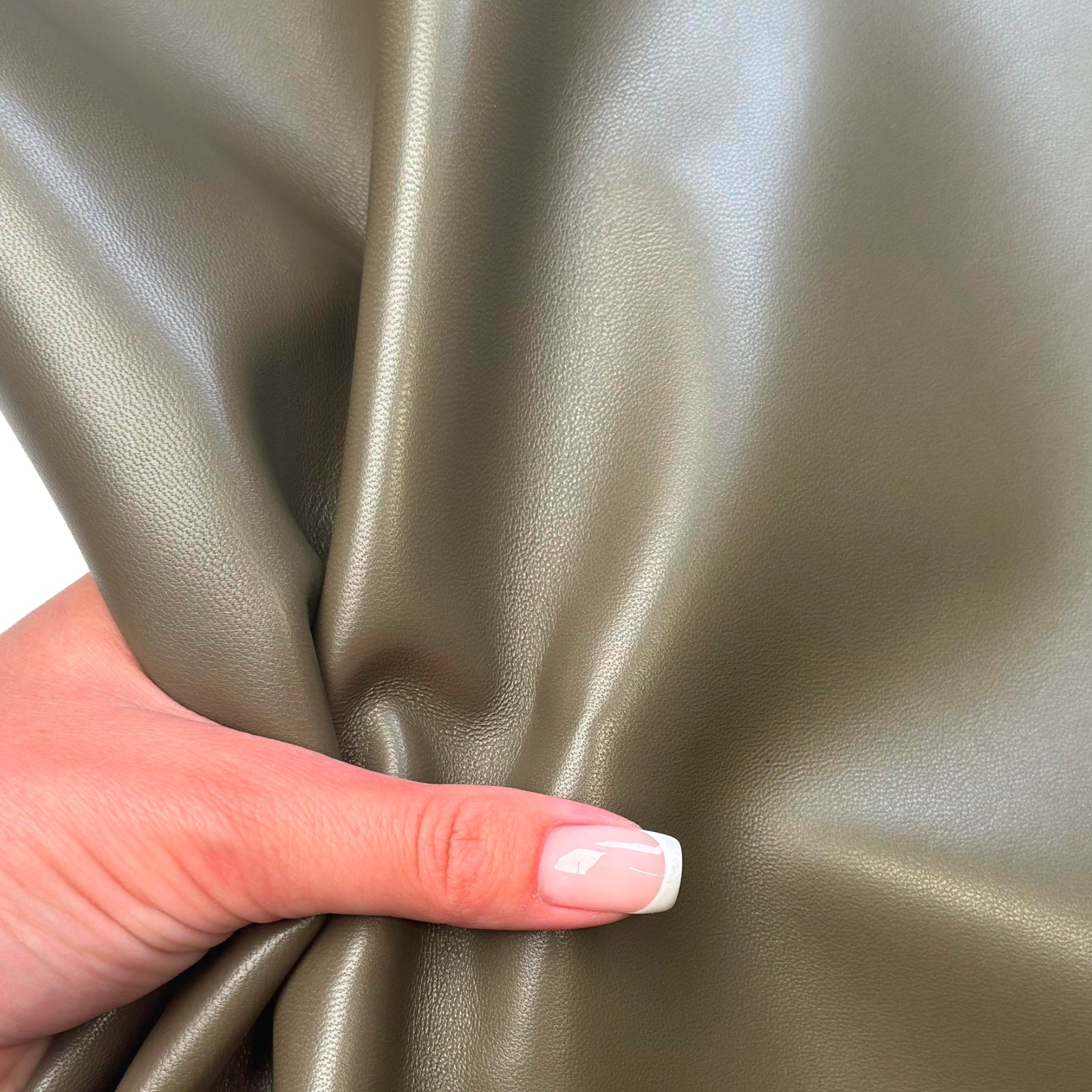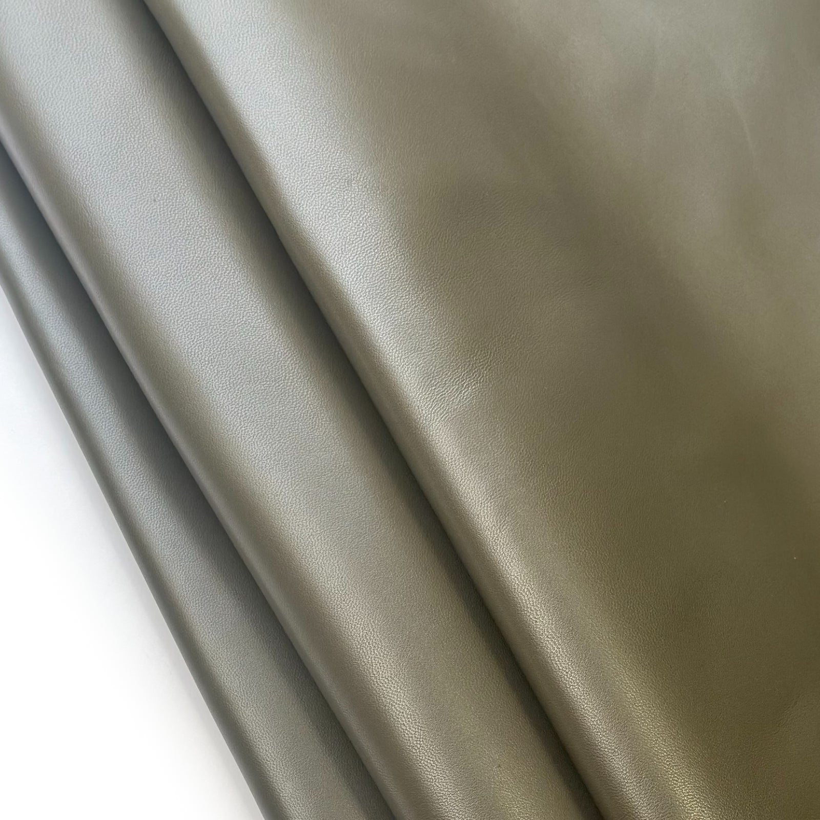 This premium lambskin leather in a deep, shiny dark khaki green offers a luxurious finish with a soft, supple hand. Ideal for a variety of crafting and DIY projects, including leather goods, accessories, garments, and small upholstery items.