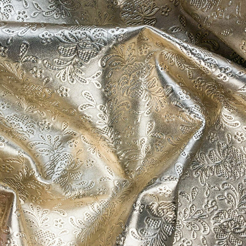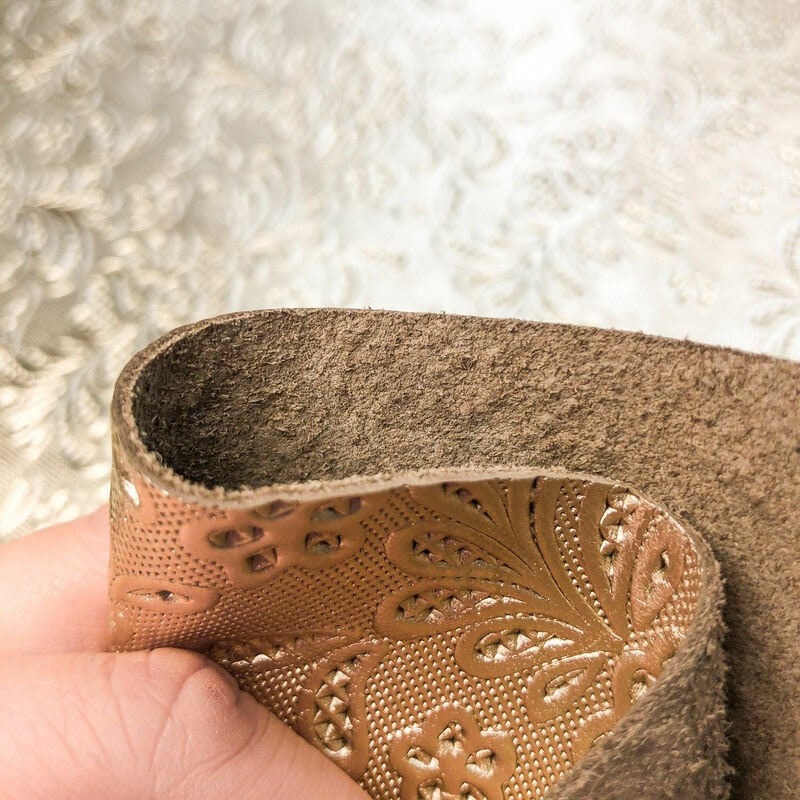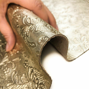 -Light gold shiny patent leather. Beautiful embossed flowers all over the light gold leather. Quite stiff and rough for sheepskin material. Will hold its shape. Jewelry supplies.