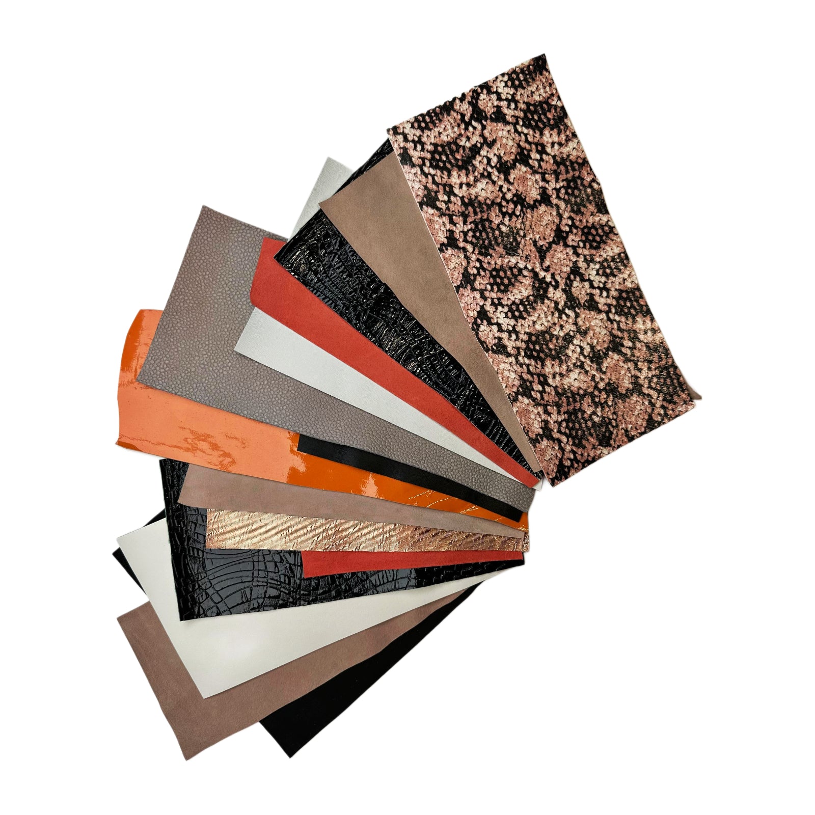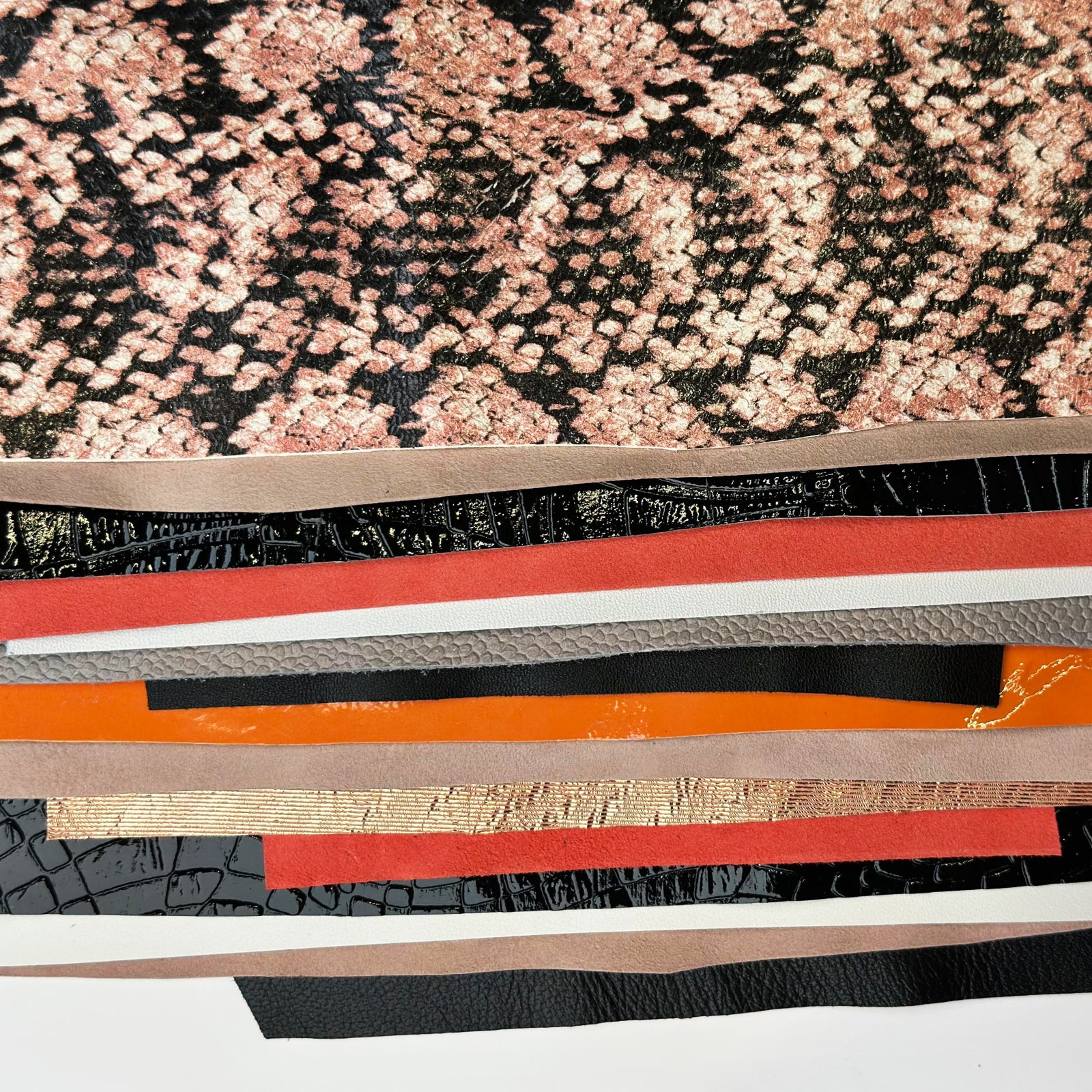 - Exclusive prints on leather scraps. Pink snake print with scales, black patent with print, orange patent, white and black lambskin, red and beige suede pieces, taupe pebbled and rose gold metallic lines.