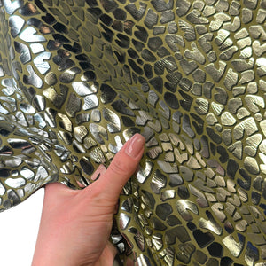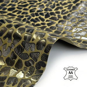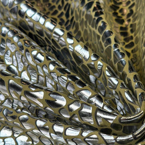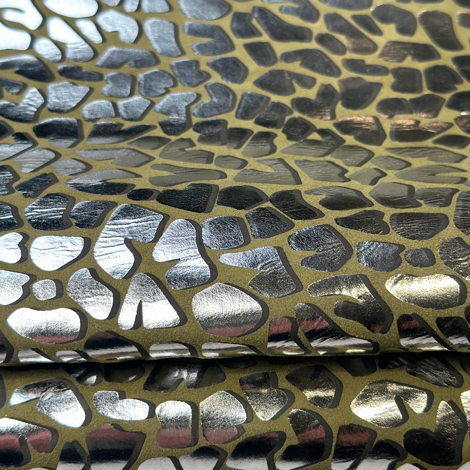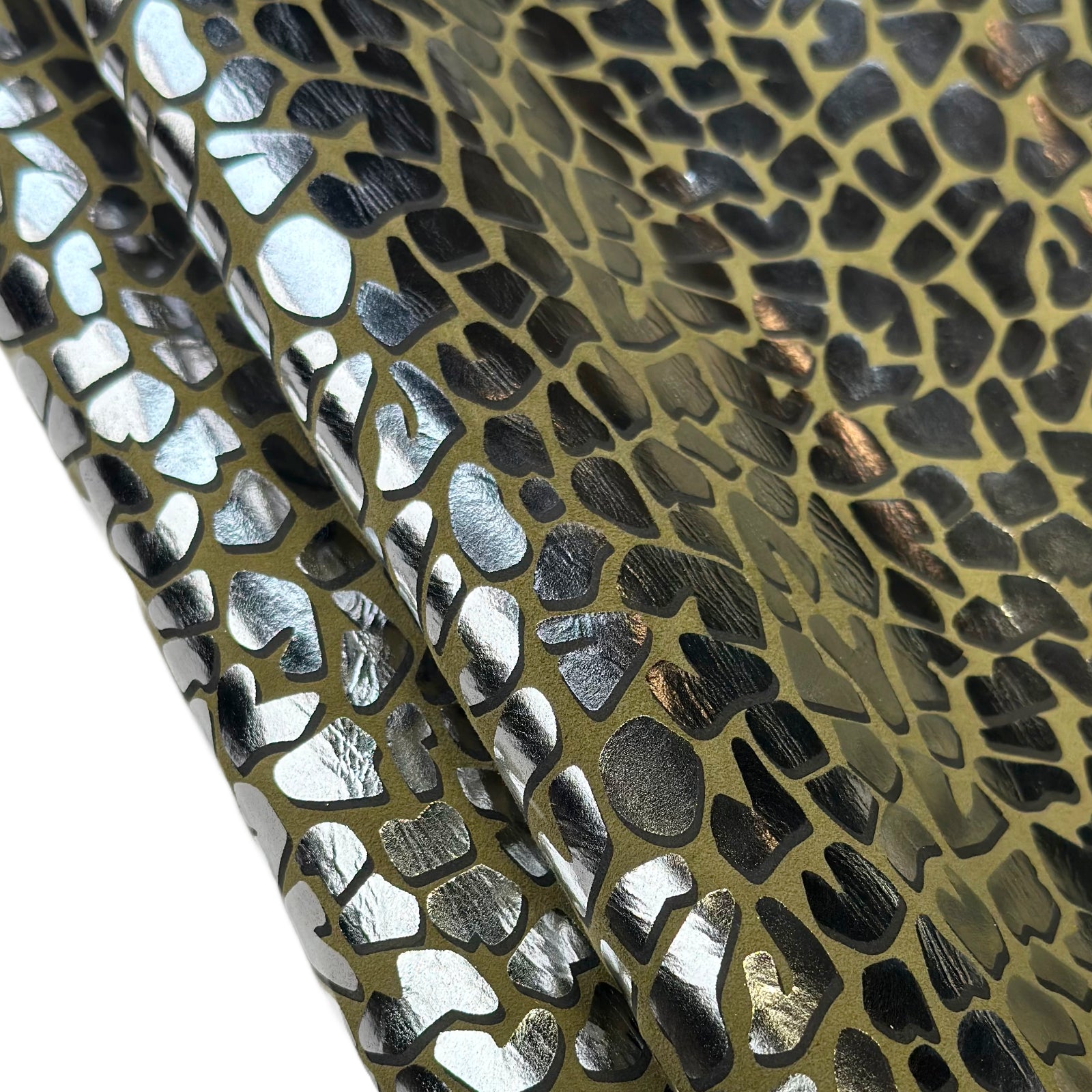 High-quality Italian lambskin leather featuring a striking metallic giraffe-inspired print. The design combines silver metallic accents over an olive-toned base, creating a bold yet elegant pattern with beautiful light reflection. Name:...
