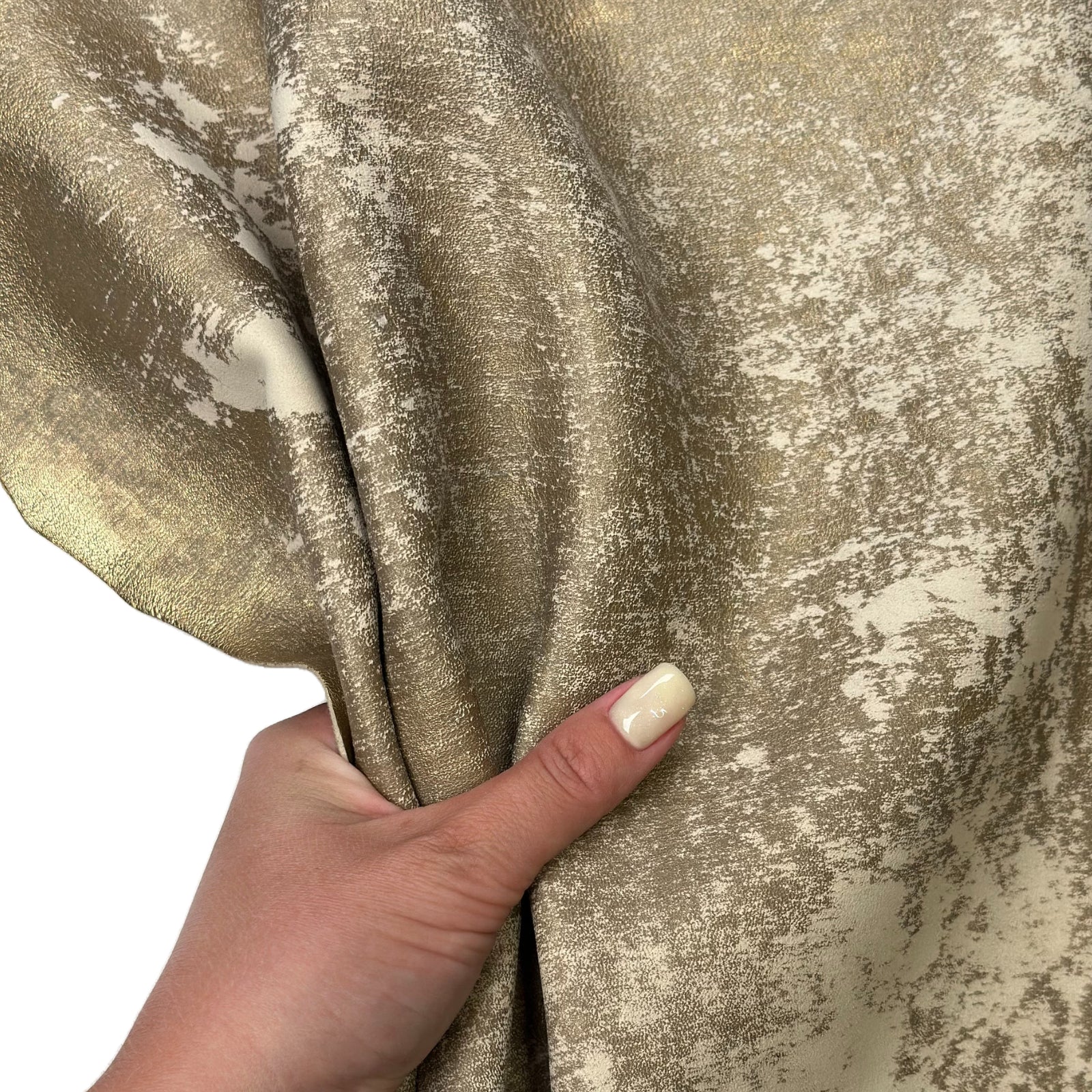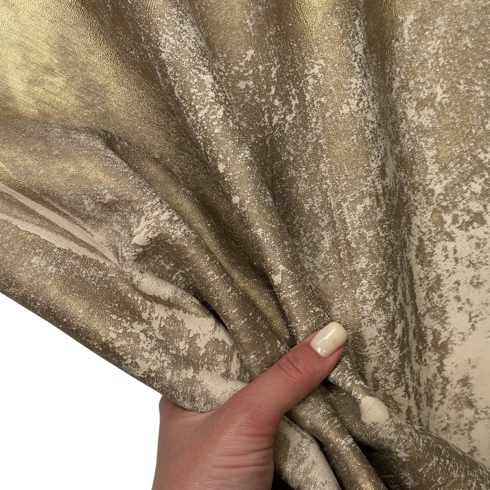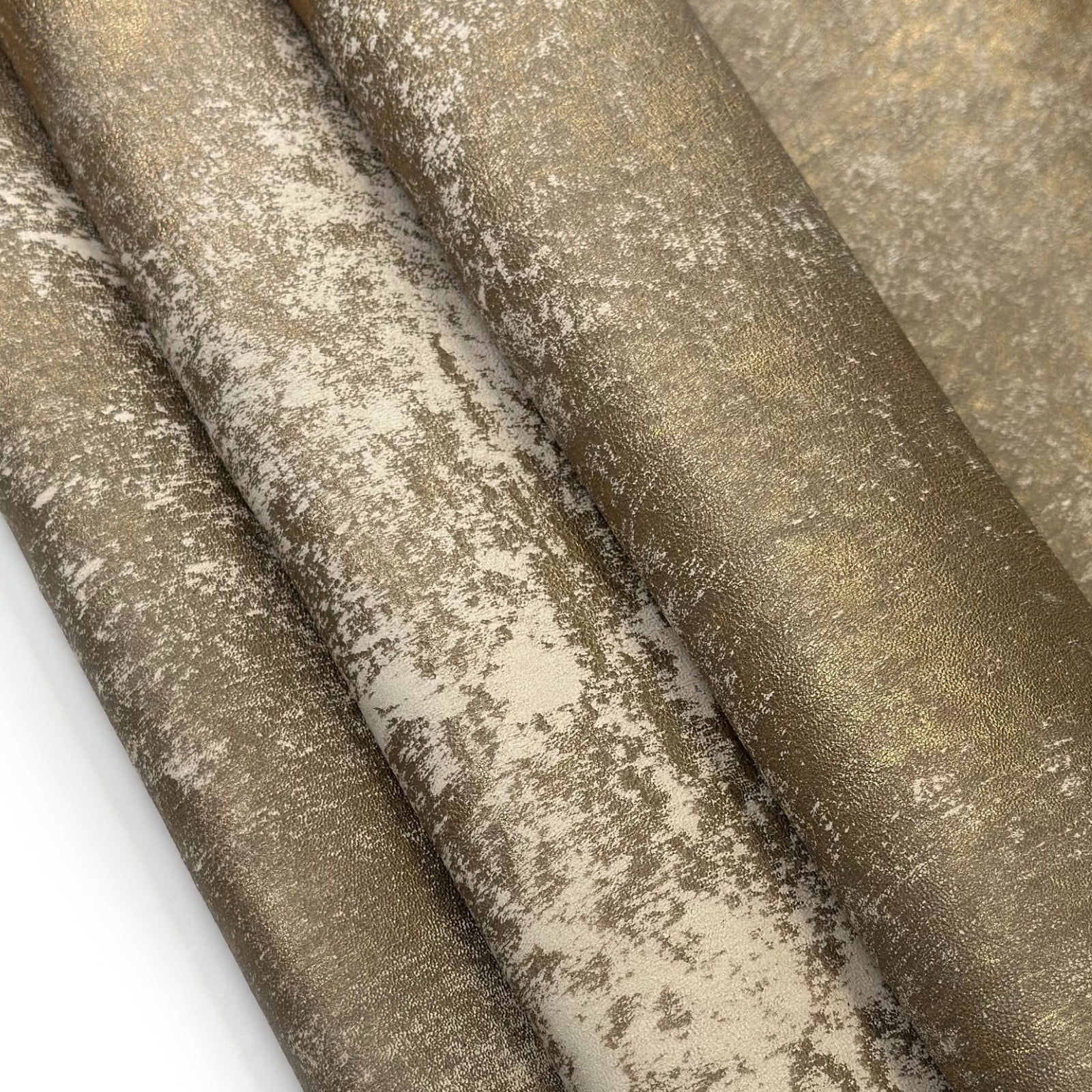 Bring a pop of shine and luxury to your projects with this genuine lambskin leather in a gorgeous metallic gold color mixed with a beige distressed look. Perfect for statement pieces, accessories, and creative DIY designs. āØ