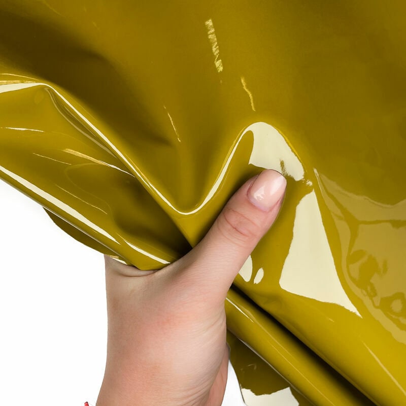 - Mustard color leather. Shiny lacquer leather pieces. Glossy lambskin fabric material. Backside is light beige. Perfect leather for sewing skirts, pants, jackets.