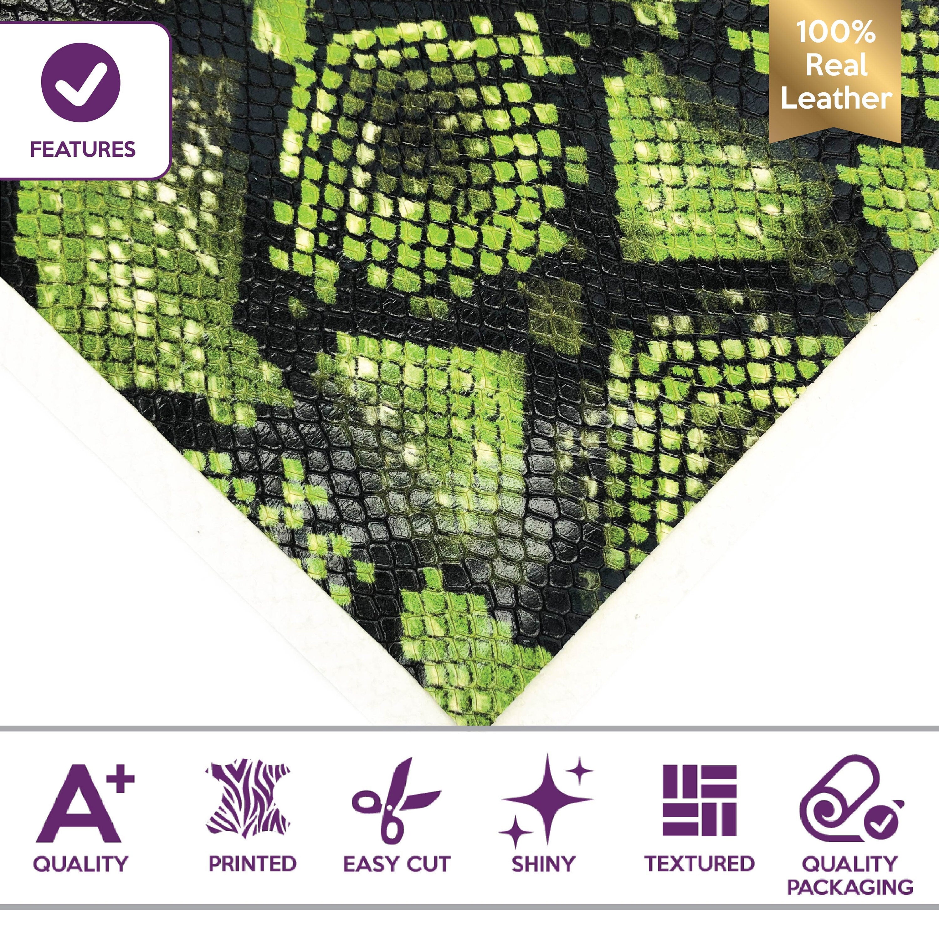 - Leather pieces with green snake texture. Leather is thick and will definitely hold it's form. Scraps are shiny polished. Leather will be perfect for all kind of DIY jewelry. High quality Italian lambskin.