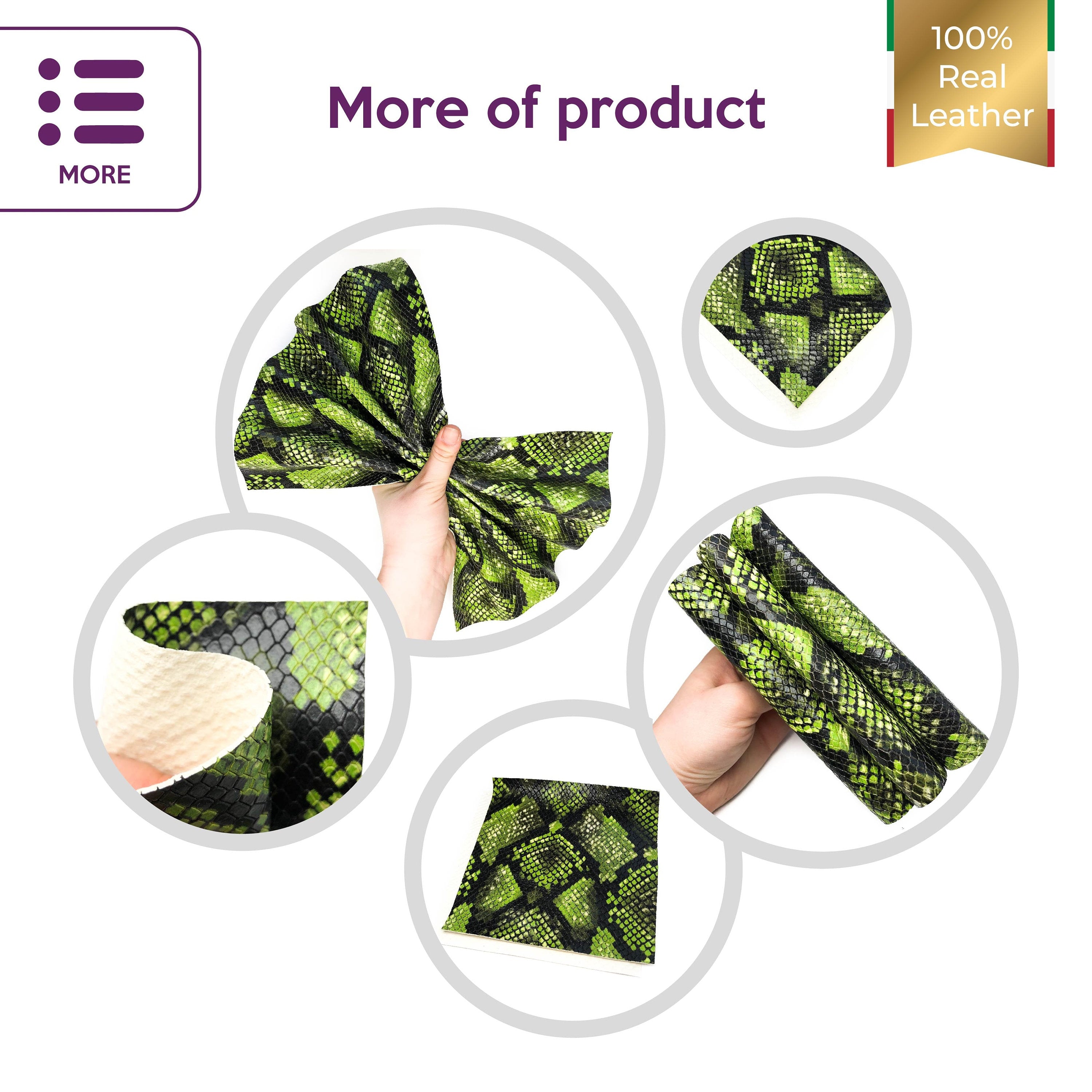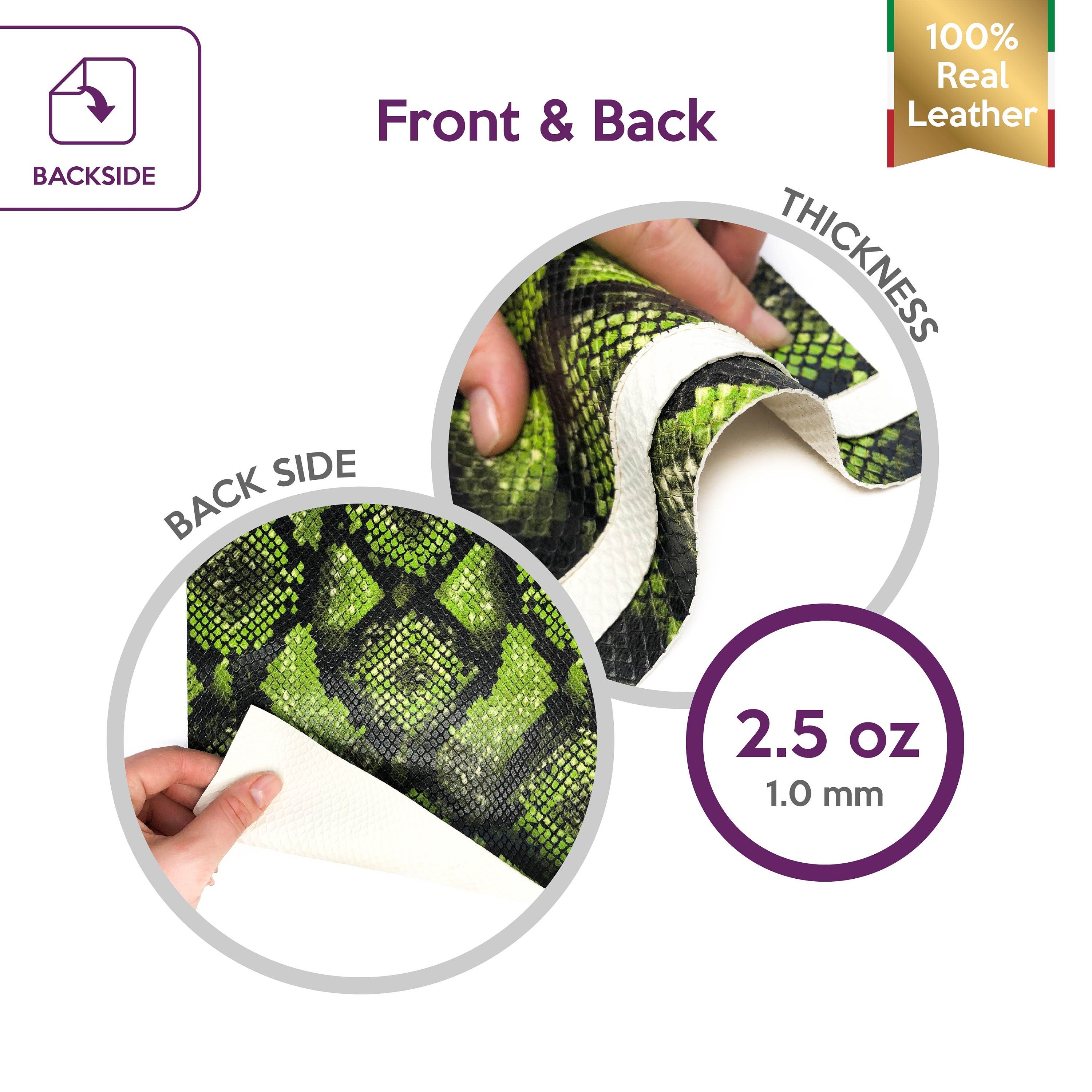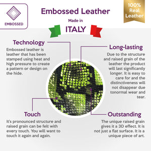 High-quality lambskin leather sheets with snake print. Neon leather pieces with shiny polished snake texture for your best projects! Our mission is to provide only the best quality Italian leather samples...