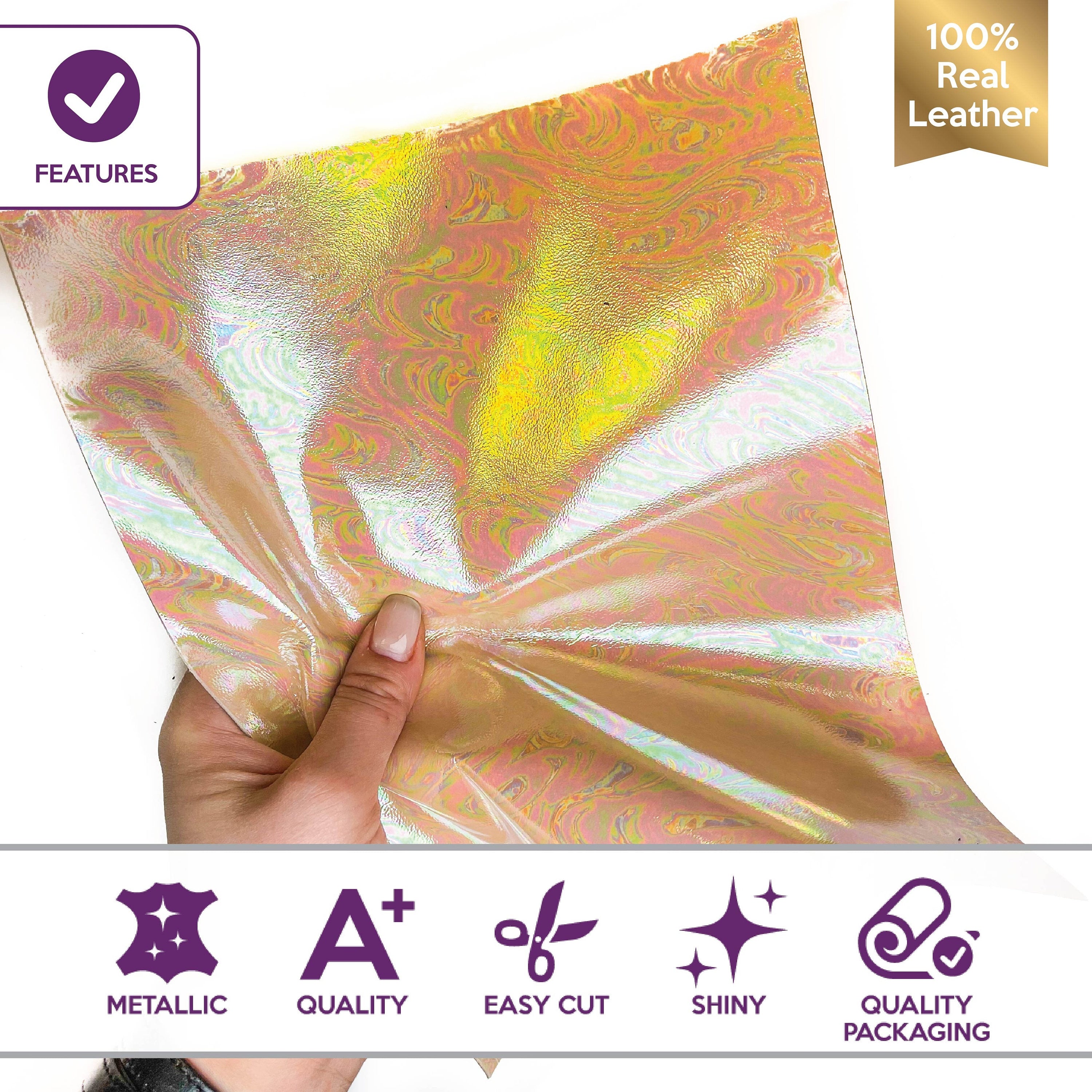 - Leather pieces looks like PETROL splash metallic leather print. Super shiny and colorful (size) leather pieces. This seasons HIT! Limited edition leather print.