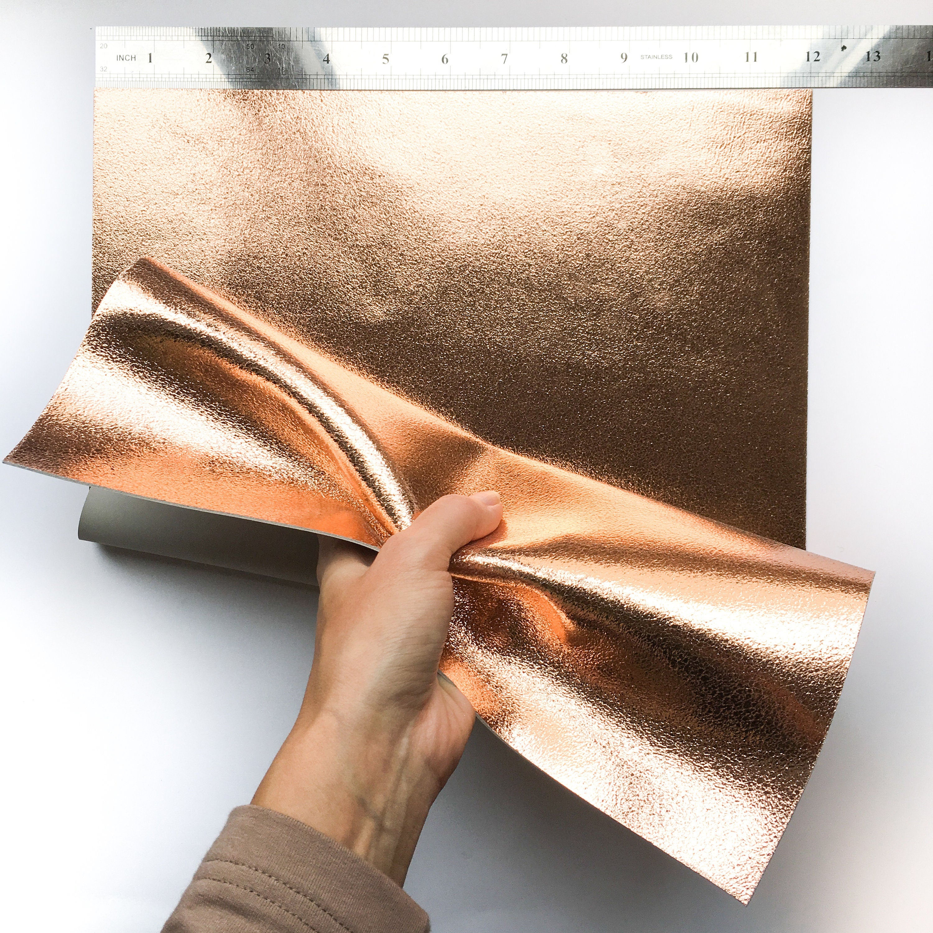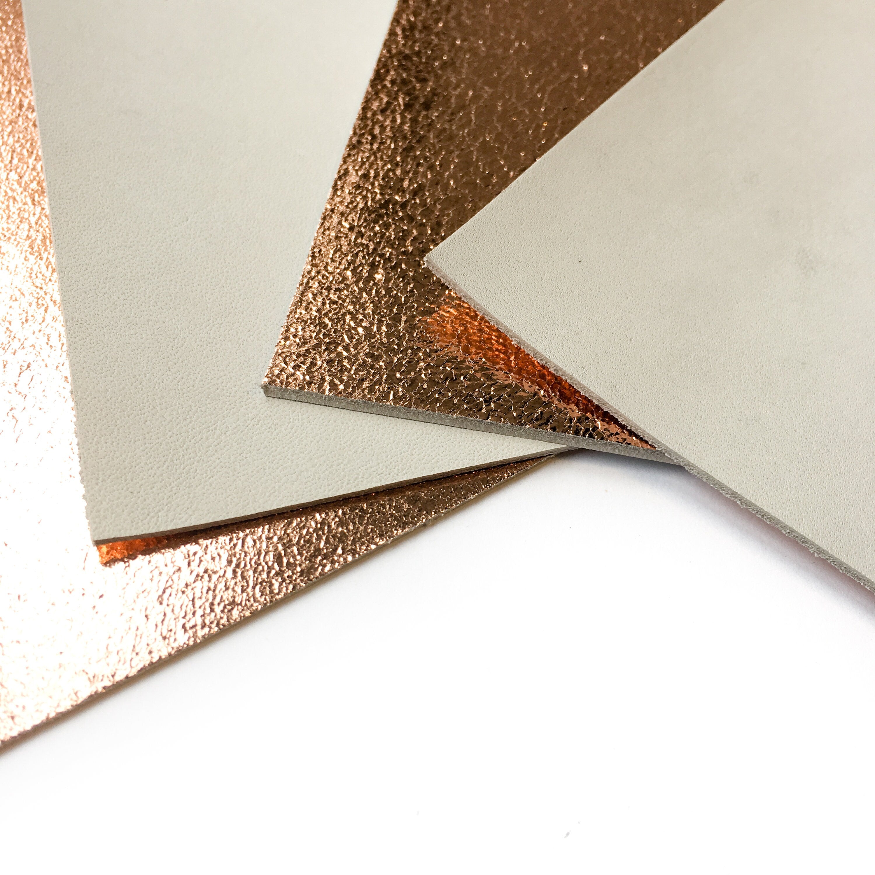 NEW ROSE GOLD SHEEP SKIN SHEETS 2.5 oz Supple and glossy rose gold metallic leather sheets with tiny crackle texture. Clean, light gray backside - with visible grain. Can be used...