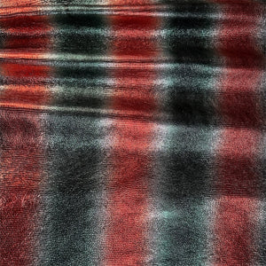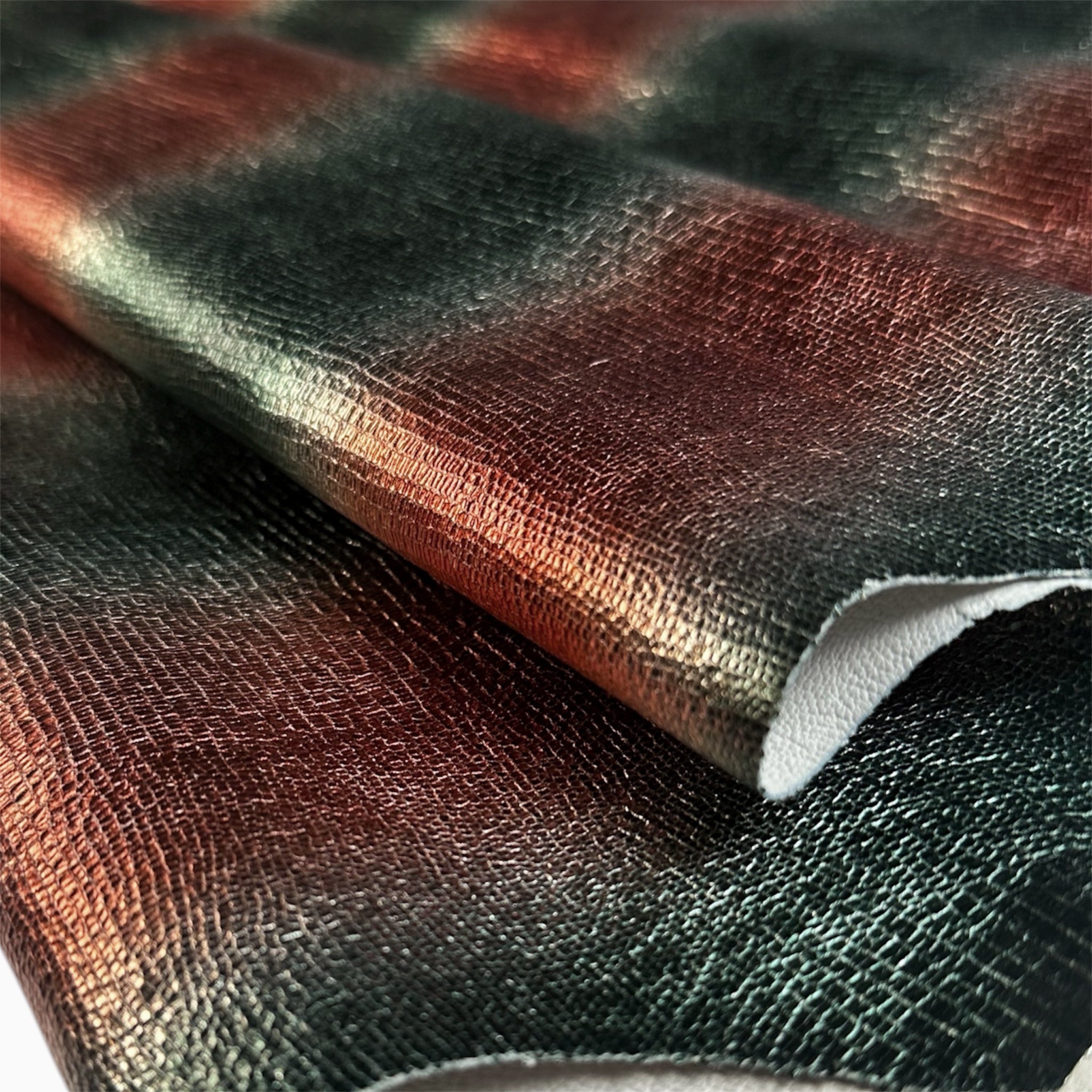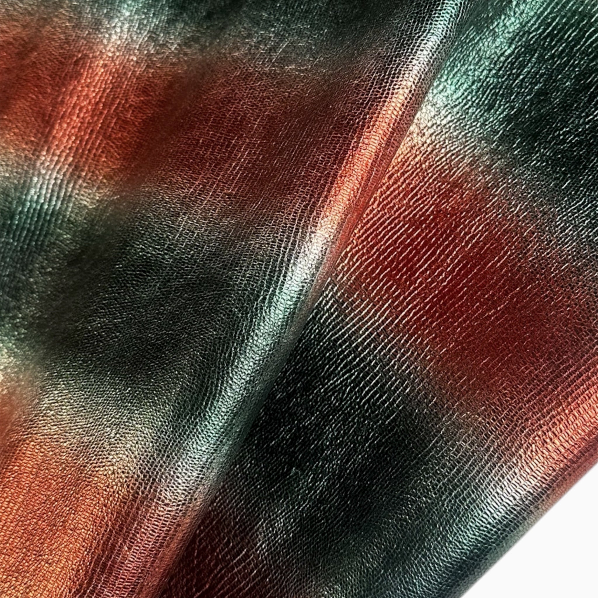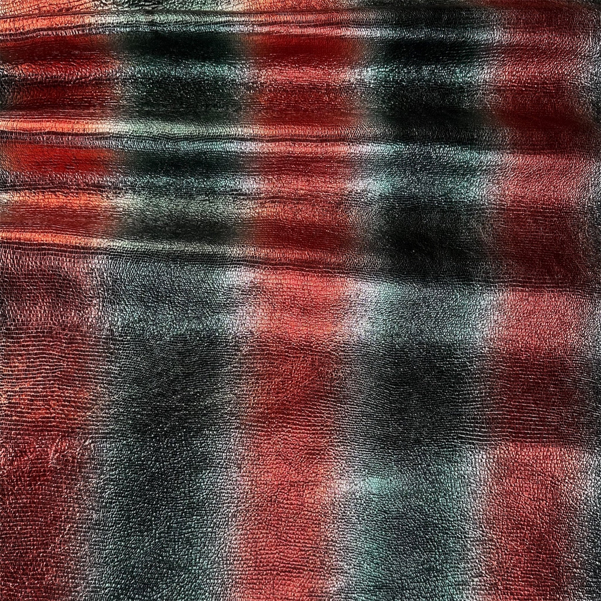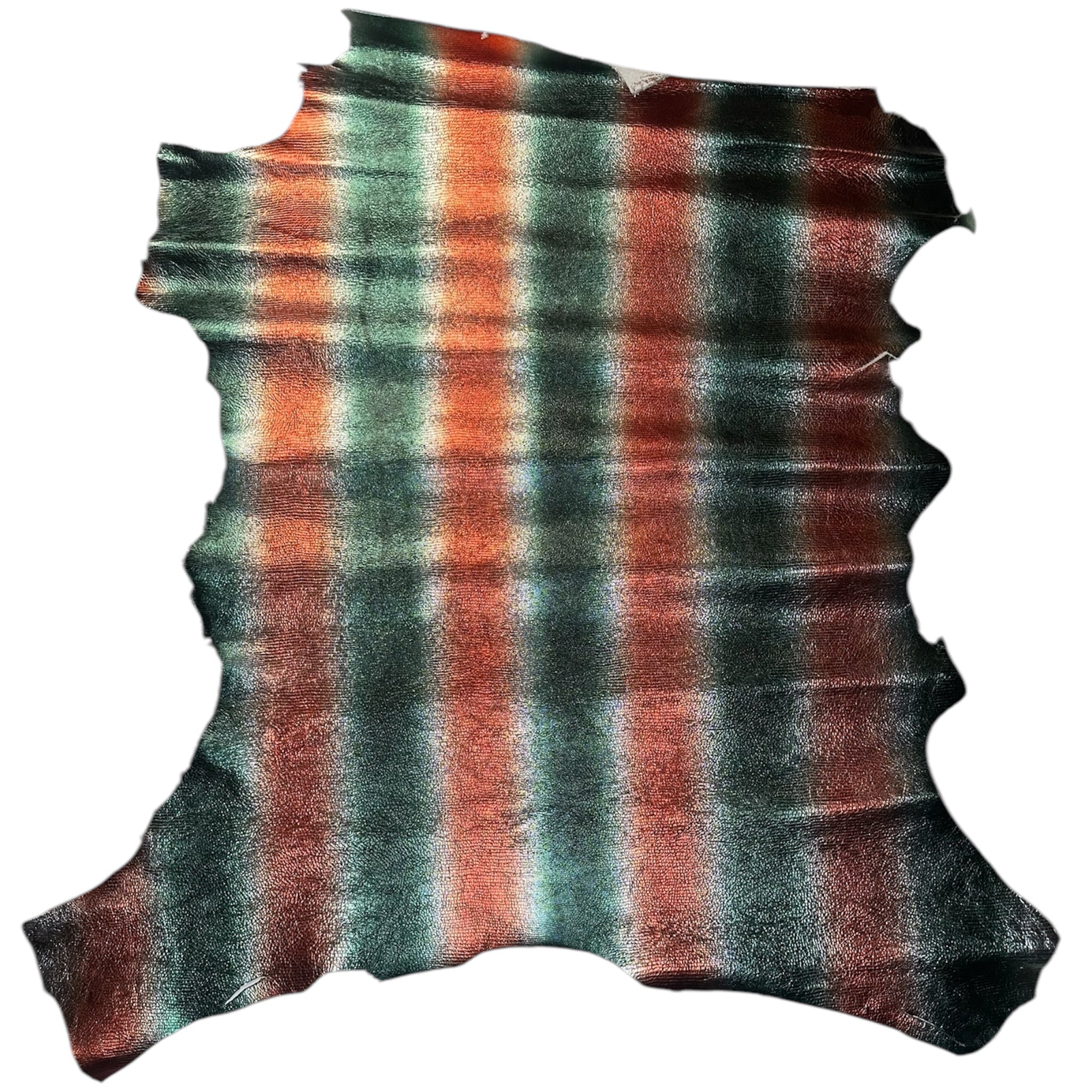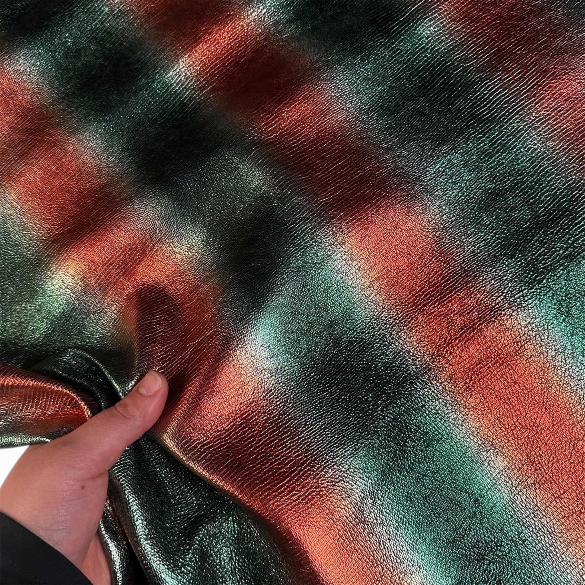 Sparkly lambskin with red and green lines print. Shiny metallic textured hides.