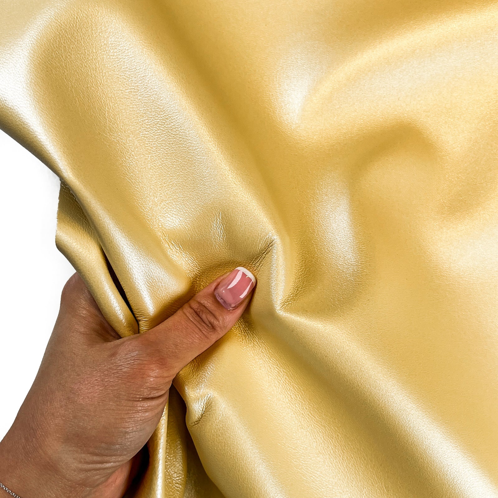 Yellow lambskin leather with unique perlamuter shine! Amazing leather for bag and purse crafters will be long-lasting. Our mission is to provide only the highest quality Italian leather to other leather workers, crafters of all kinds, small businesses, or shops for your projects.
