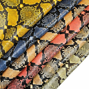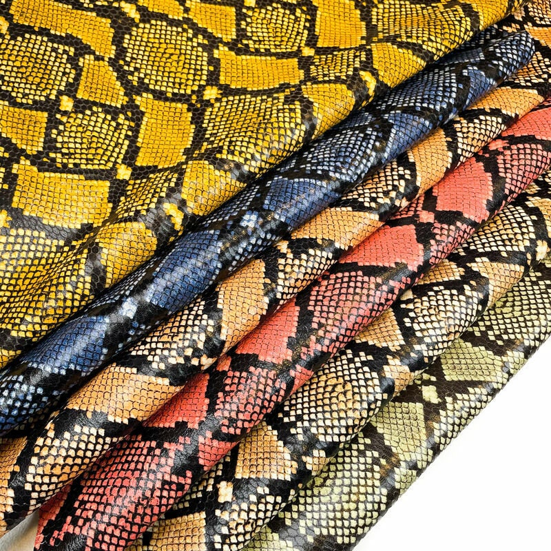 - Colorful leather with python/ snake skin print all over. Various colors to choose from. Soft to touch, also can feel a little glossy shine. Bit stiff but easy to fold. Backside is off white and soft. Perfect for leather accessories.