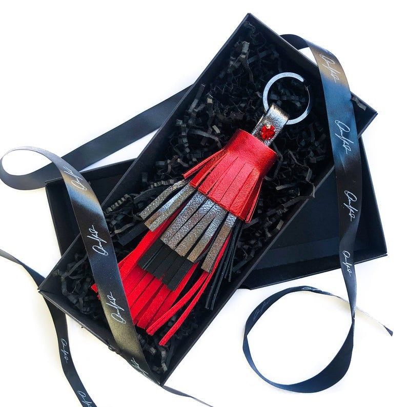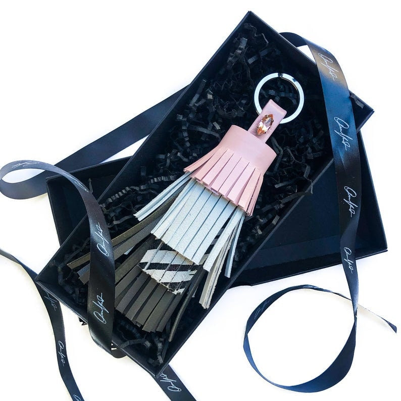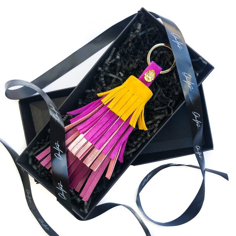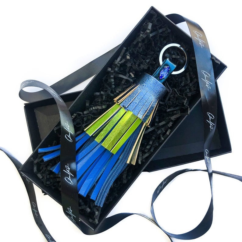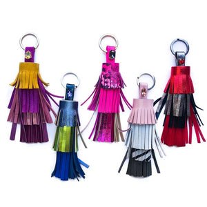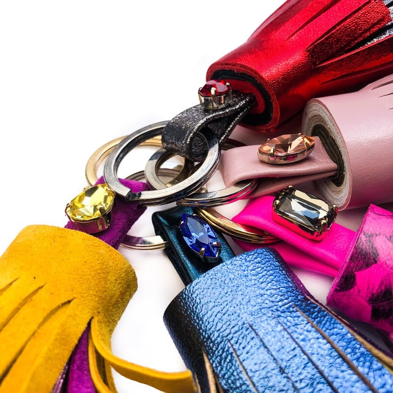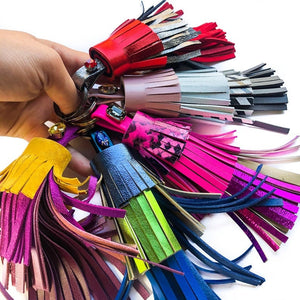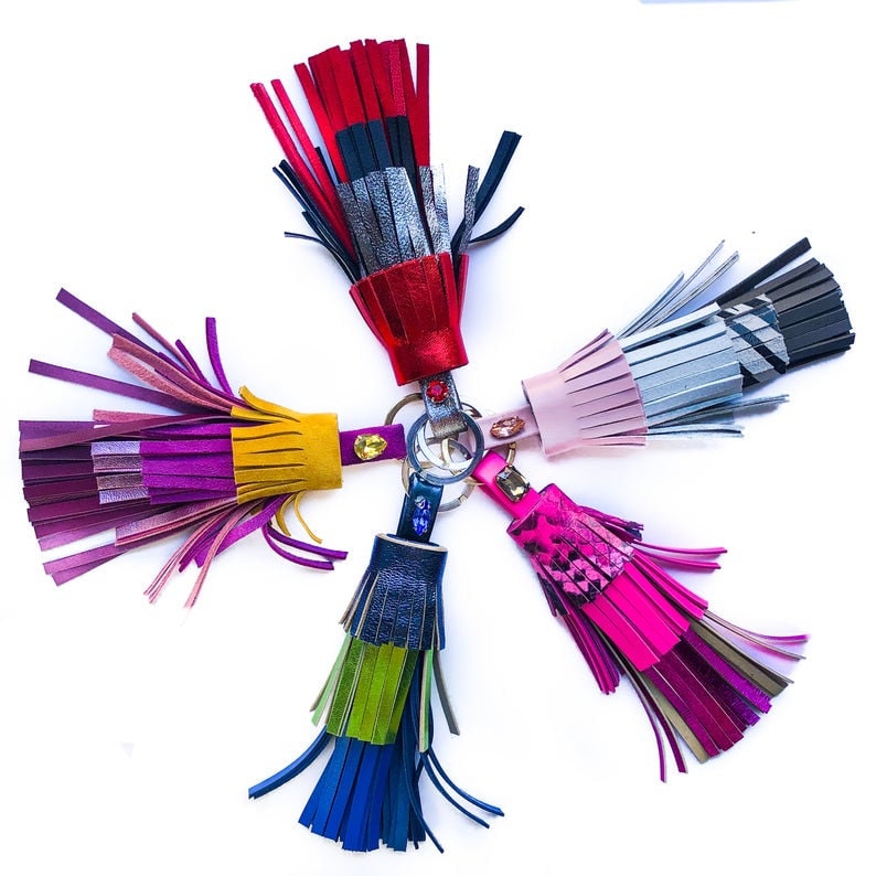 Unique handmade COLORFUL Leather tassel key-chains. From exotic animals and metallic print leather from Italy. Only the finest quality leather and genuine Swarovski crystals are used to make these one of a kind pieces. Packed in a gift box for a really elegant look.