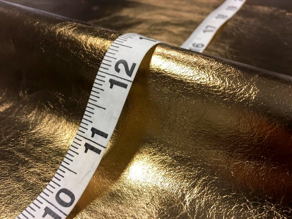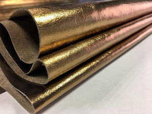 -Quite firm, but pleasant for touch, lightweight, thin dark gold calf hides are great for leather crafts, is not too elastic, good for leather crafts that require firm, bit rigid leather. Festive Dark golden color, bronze print on shaved calf leather. Can be used as fabric for gold bag making, glossy leaf leather earrings, natural leather material for necklaces and other charming, shiny, luxurious accessories. Perfect material for brave, metallic leather jackets and other clothing for stunning look!