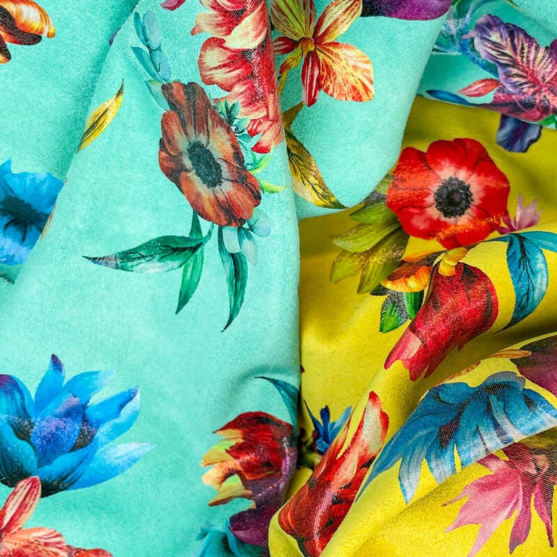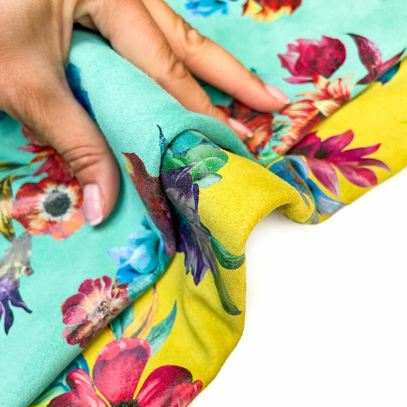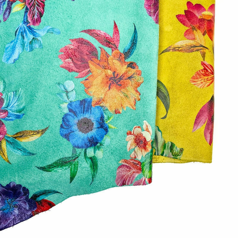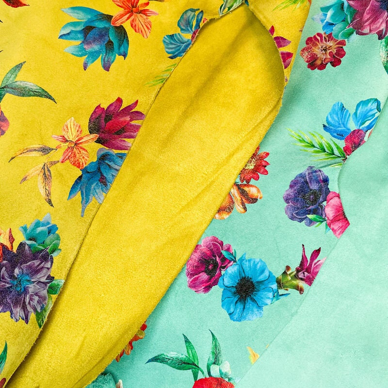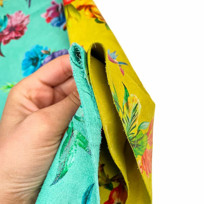 - Genuine cowskin leather hides. Choose your color - mint green 0.9mm thick or yellow 0.7mm thick. Beautiful floral print all over fabric! Both types are thick. Natural calf pieces can vary 0.7 mm - 0.9mm / 1.5oz - 2.25oz