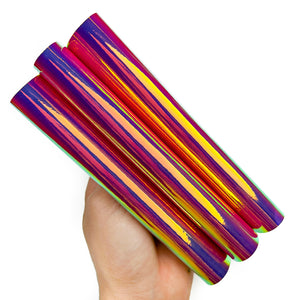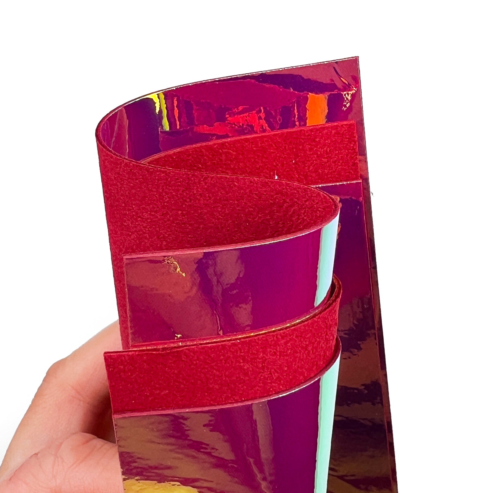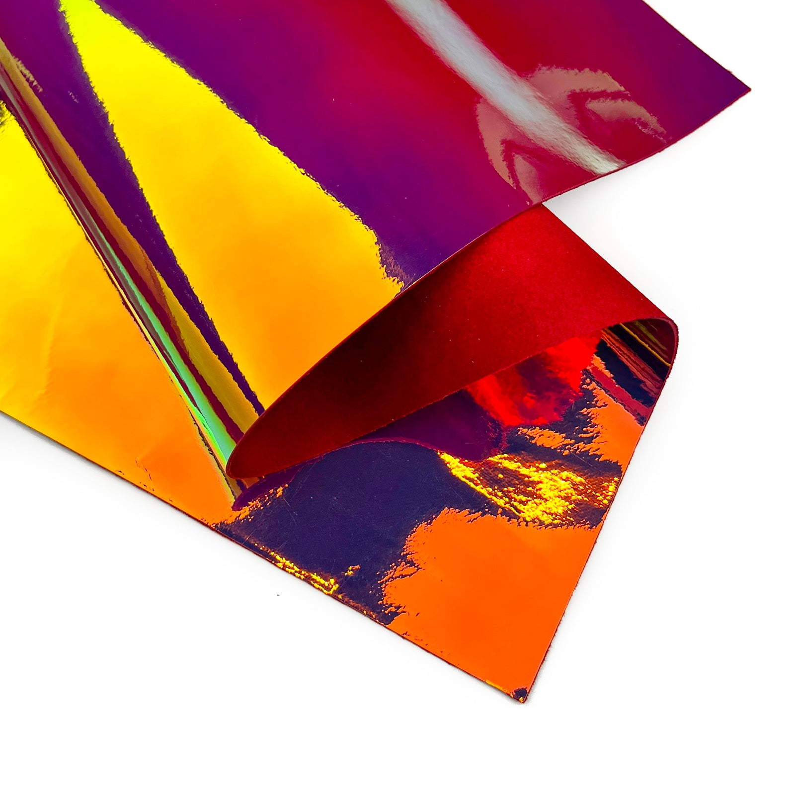 Bright Various metallic red, purple and orange leather holographic colors. Shiny mirror effect sheets. Need to be careful with folding - can leave visible marks.