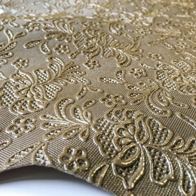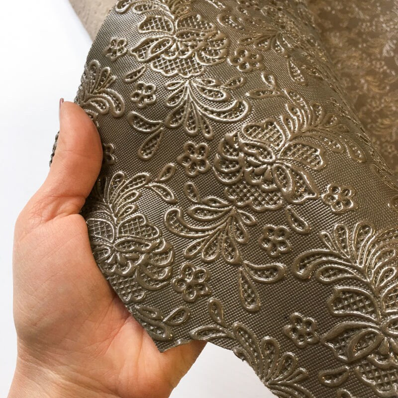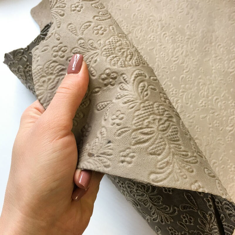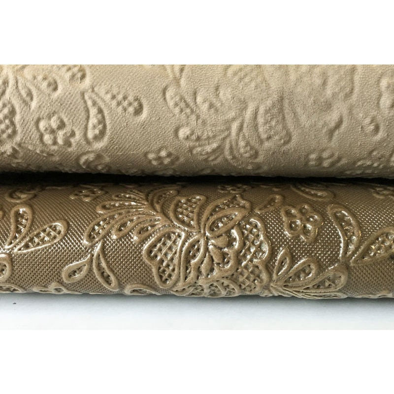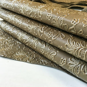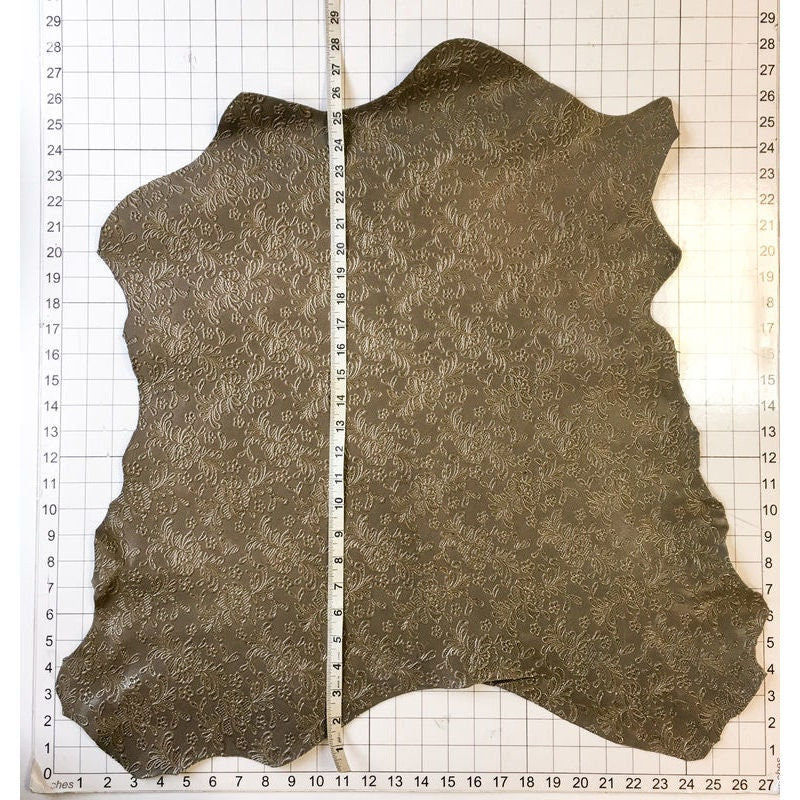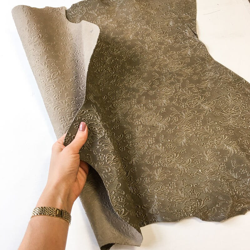 -Shiny lacquer leather print, covert green leather material with stamped flower print. Quite stiff and rough for sheep skin material. Small pieces ~ 0.4 m2 or 4.5 sqft. Interesting green color with brown shade in it. Called COVERT GREEN. Like army/ khaki green but less intense.