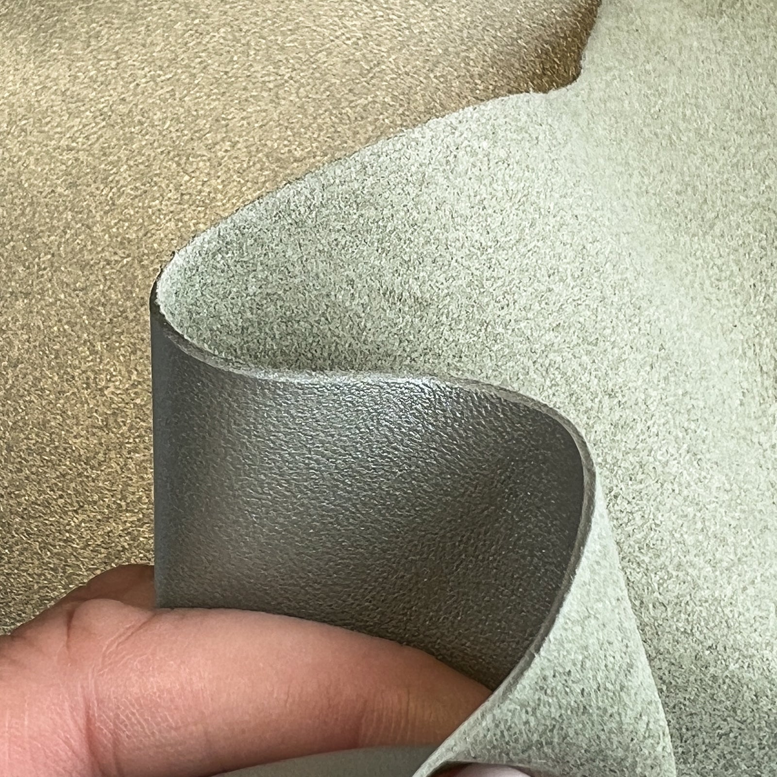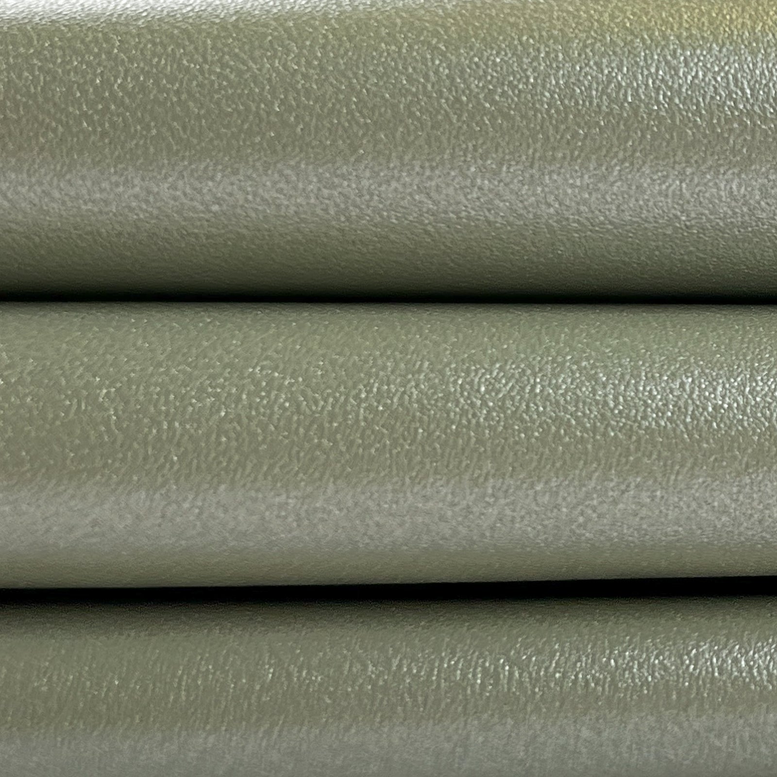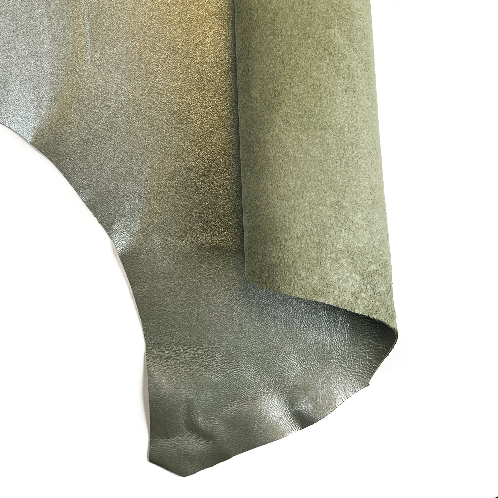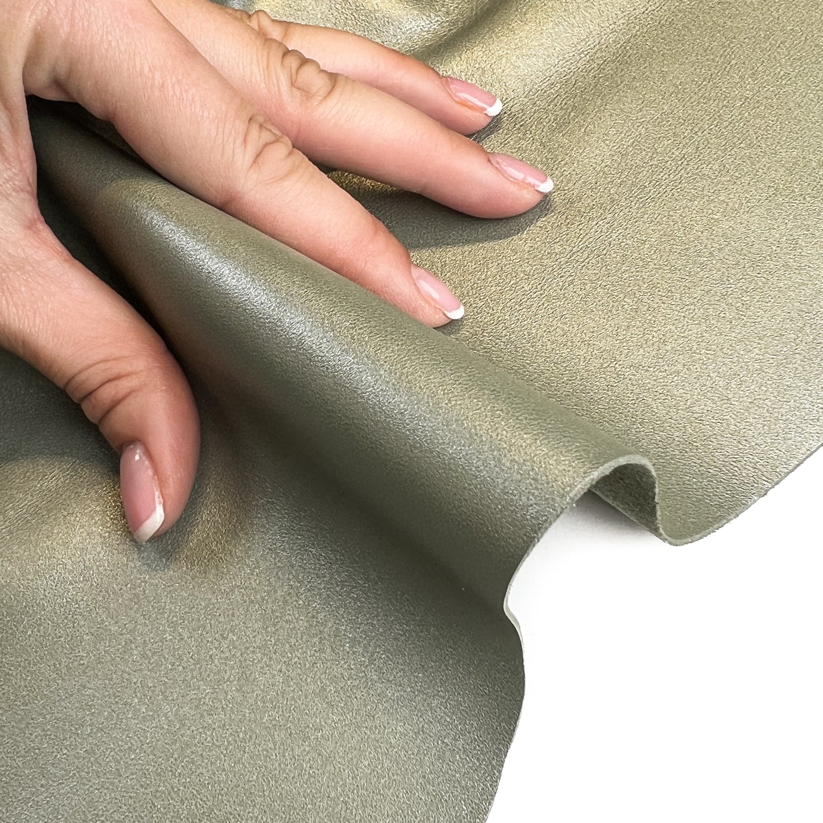 Khaki green lambskin leather with unique perlamuter shine! Amazing leather for bag and purse crafters will be long-lasting. Our mission is to provide only the highest quality Italian leather to other leather workers, crafters of all kinds, small businesses, or shops for your projects.