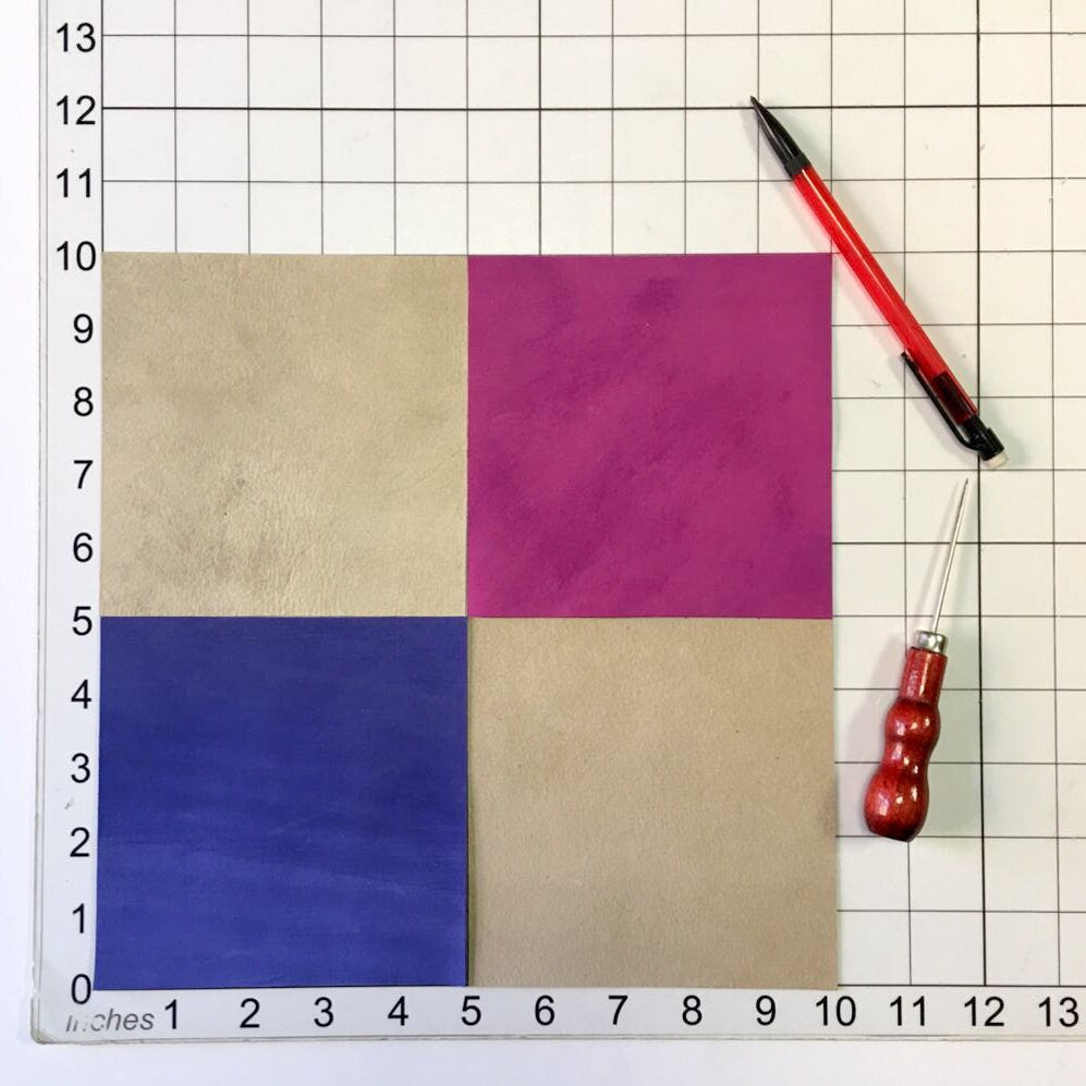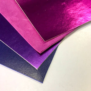 -Selection of 4 leather pieces in shiny purple, hot pink metallic pieces, bright purple suede and 1 shade of ink blue, size - 5x5 inches