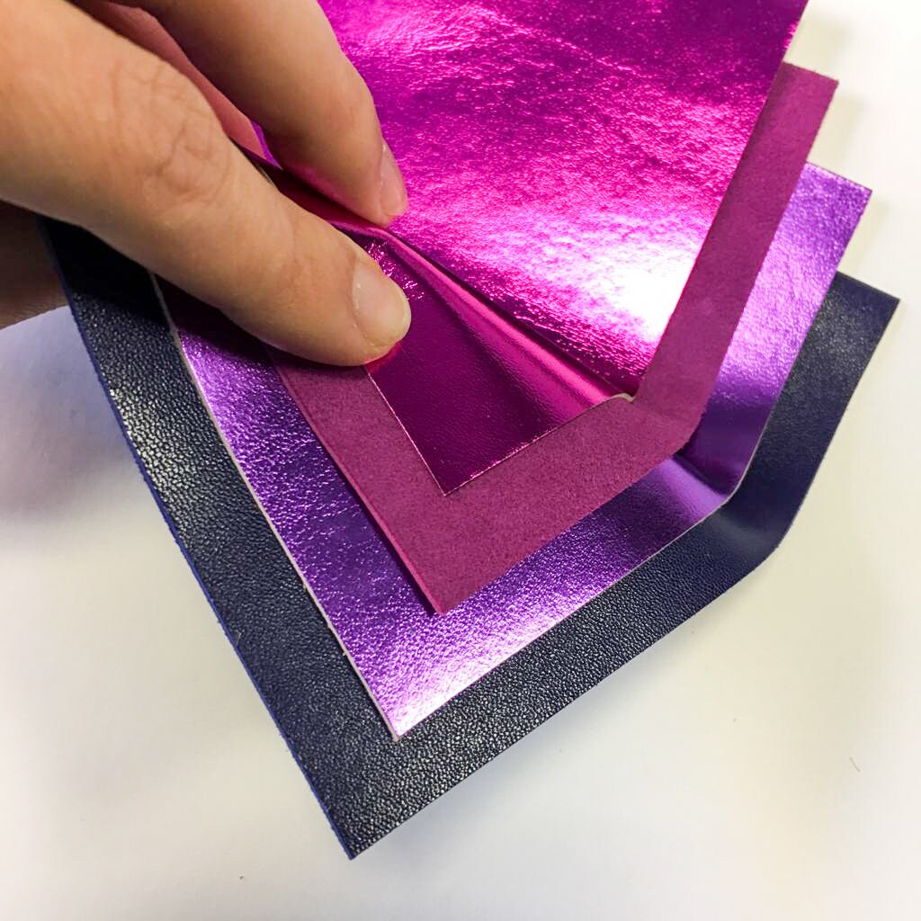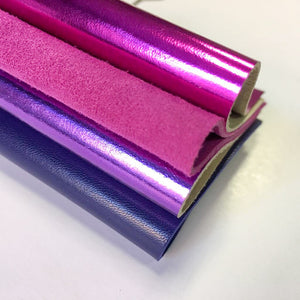 Colors: Purple (violet) metallic, Hot Pink (Fuchsia) metallic leather, shiny ink blue and fuchsia purple suede