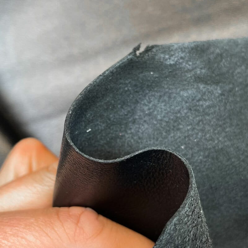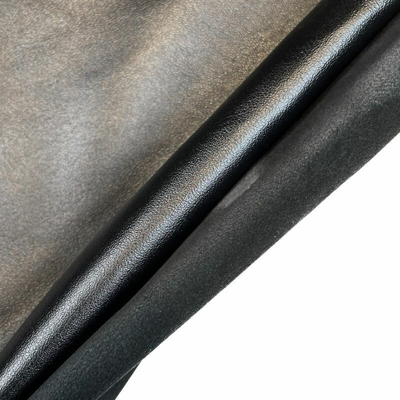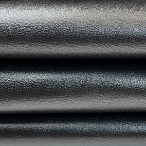 - Soft black leather with grain texture. Shiny and medium thin leather. Soft backside. Perfect leather material for leather jackets and accessories.