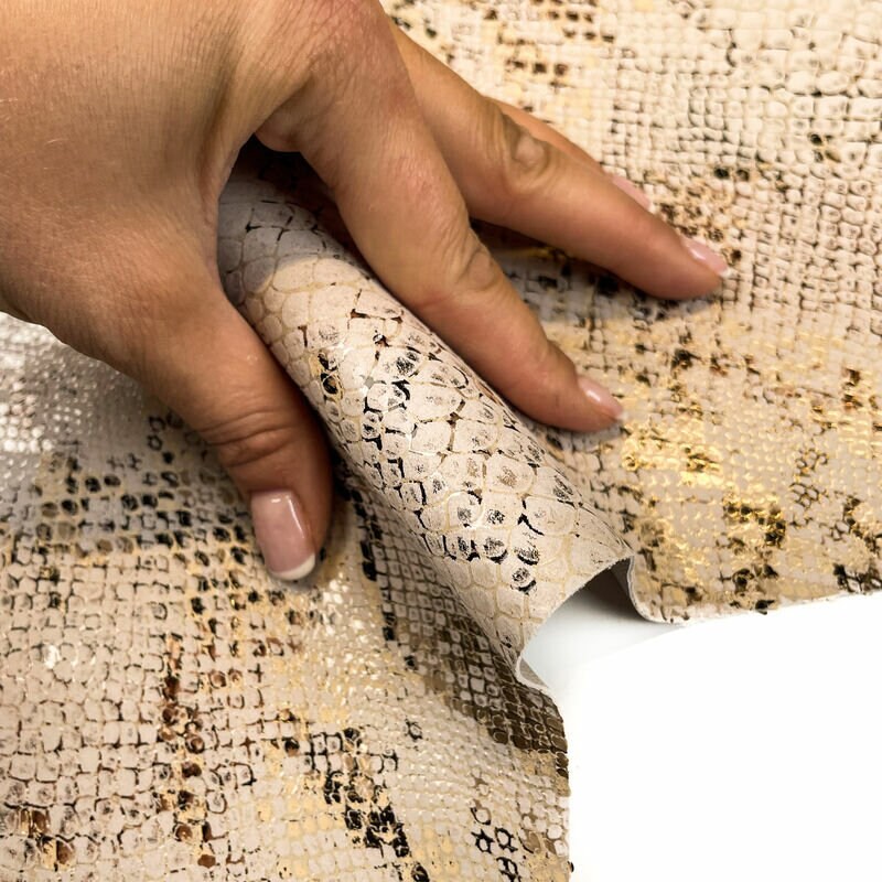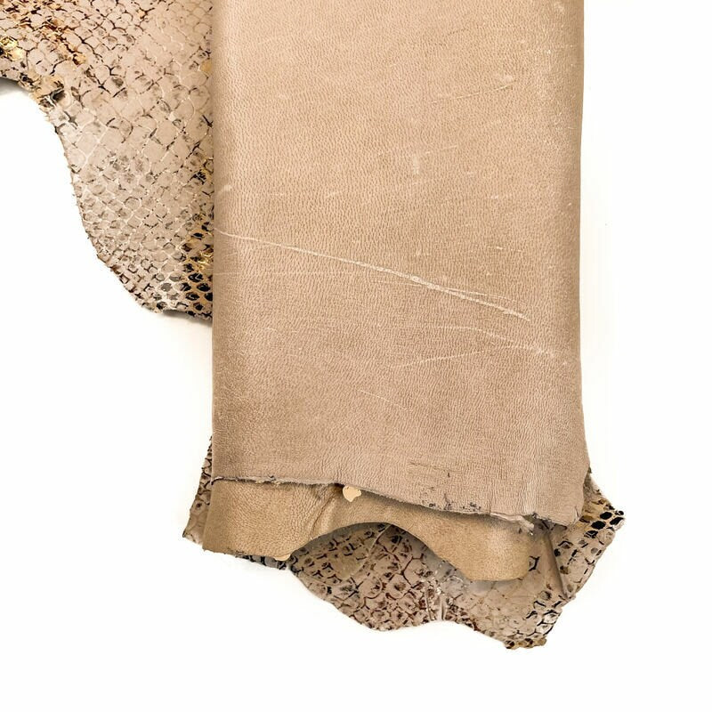- Soft beige suede leather with beautiful snakeskin print! Not too thick, easy to fold. Bit shiny. Can't see scratches. Durable and beautiful leather material for sewing. Soft to touch from both sides.