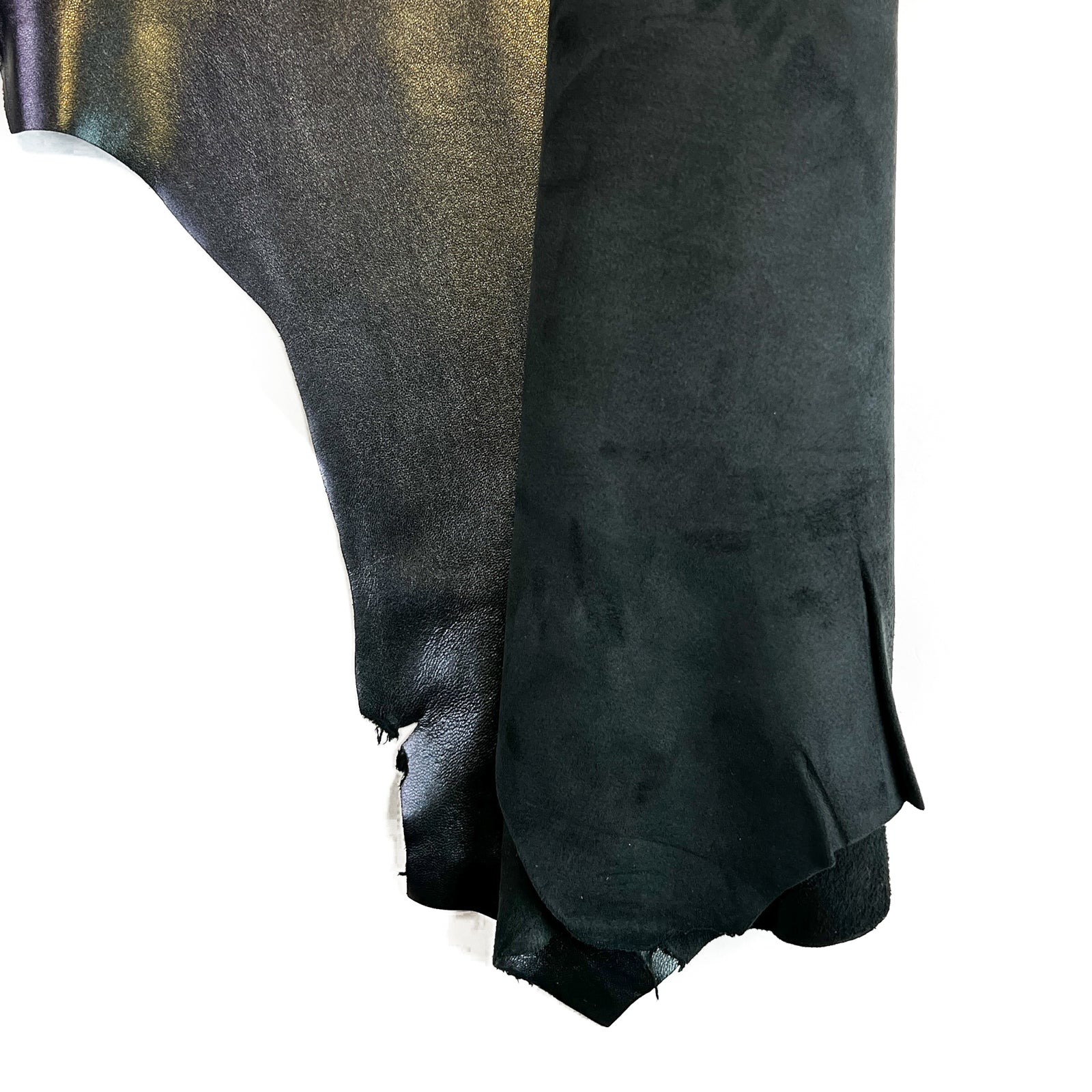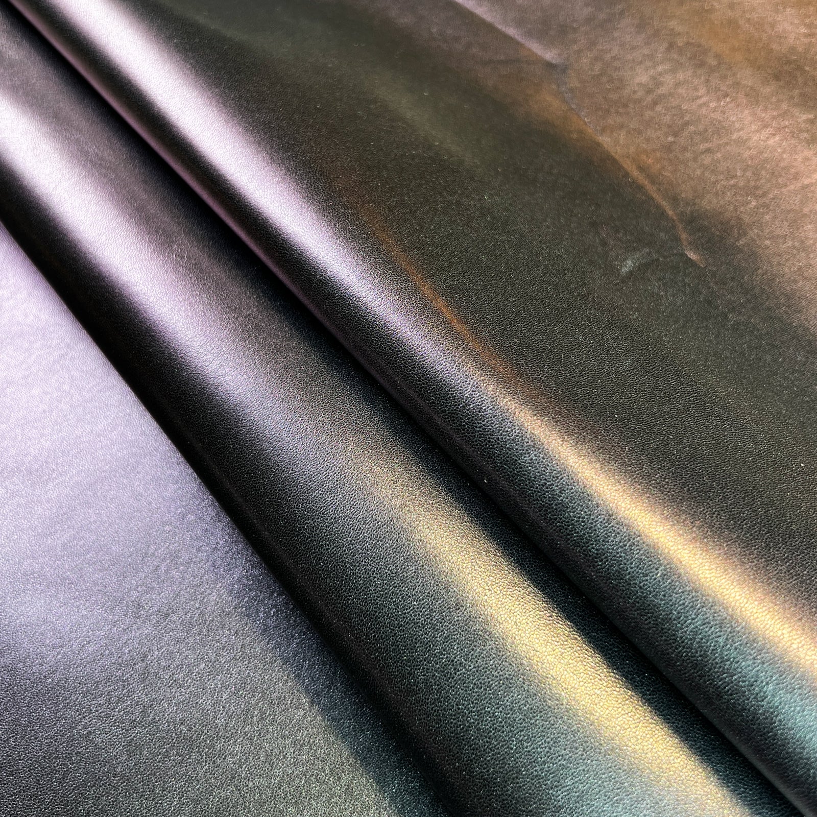 Black perlamuter lambskin with purple shine. Thick and shiny fabric. Amazing leather for bag and purse crafters will be long-lasting. Our mission is to provide only the highest quality Italian leather to other leather workers, crafters of all kinds, small businesses, or shops for your projects.