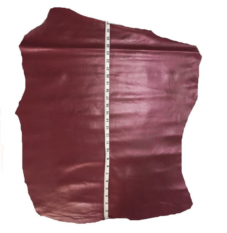 -Nice and quality burgundy leather. Pretty quite lightweight and pleasant for touch, super soft and nice to work with. Backside is almost the same color ad the front, only suede-ish type. Colored throughout. Try it!