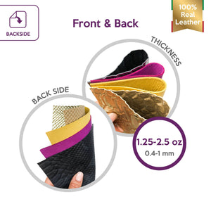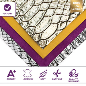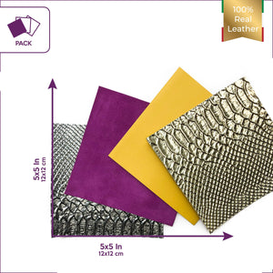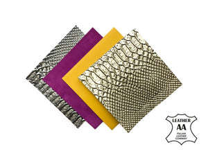 Colors: 1 yellow primrose leather sheet, 1 viola suede leather sheet, 1 metallic gold snake print and 1 metallic silver snake print.