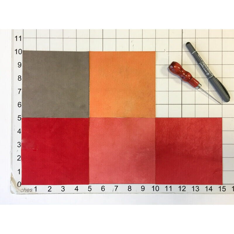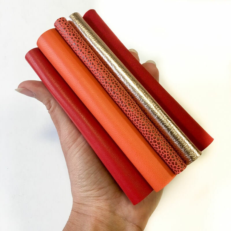 FIVE Pre-cut leather Sheets in RED, ORANGE, DOTTED RED, ROSE GOLD AND RED SUEDE COLORS.